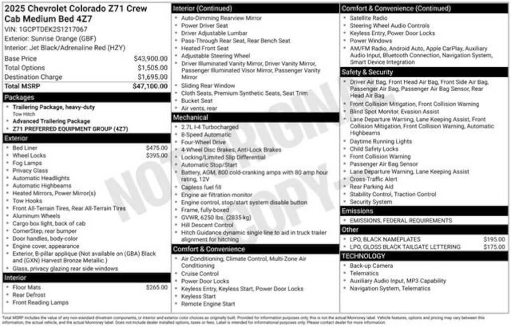 Sunrise Orange 2025 Chevrolet Colorado Z71 4D Crew Cab 4WD 2.7L I4 Turbocharged DOHC 16V LEV3-ULEV50 310hp 8-Speed Automatic