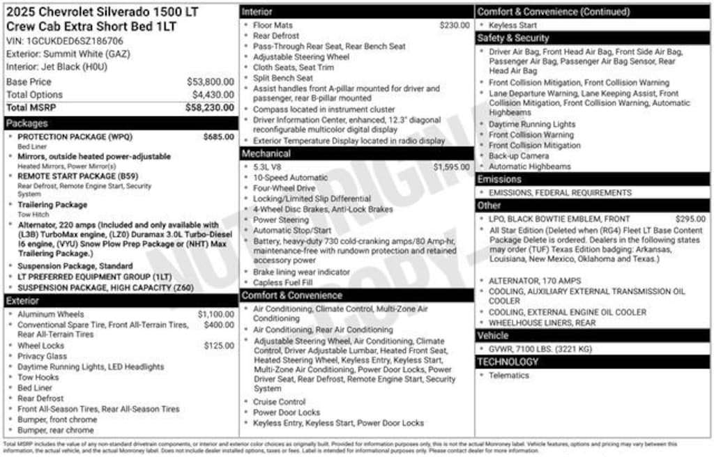 10-Way Power Driver Seat w/Lumbar, 12.3 Multicolor Reconfigurable Digital Display, 120-Volt Bed Mounted Power Outlet, 120-Volt Interior Power Outlet, 3.23 Rear Axle Ratio, 4-Wheel Disc Brakes, 6-Speaker Audio System, ABS brakes, Air Conditioning, All-Star Edition, AM/FM radio: SiriusXM with 360L, Apple CarPlay/Android Auto, Auto High-beam Headlights, Auto-Locking Rear Differential, Automatic Emergency Braking, Automatic temperature control, Bluetooth® For Phone, Brake assist, Chrome Mirror Caps, Color-Keyed Carpeting Floor Covering, Compass, Convenience Package, Deep-Tinted Glass, Dual front impact airbags, Dual front side impact airbags, Dual Rear USB Ports (Charge Only), Dual-Zone Automatic Climate Control, Electric Rear-Window Defogger, Electronic Cruise Control, Electronic Stability Control, Emergency communication system: OnStar, EZ Lift Power Lock & Release Tailgate, Following Distance Indicator, Forward Collision Alert, Front dual zone A/C, Front Frame-Mounted Black Recovery Hooks, Front Pedestrian Braking, Front Rubberized Vinyl Floor Mats, Fully automatic headlights, HD Rear Vision Camera, Heated Driver & Front Outboard Passenger Seats, Heated Power-Adjustable Outside Mirrors, Heated Steering Wheel, Hitch Guidance, Illuminated entry, Inside Rear-View Mirror w/Tilt, Integrated Trailer Brake Controller, IntelliBeam Automatic High Beam On/Off, Keyless Open & Start, Lane Keep Assist w/Lane Departure Warning, LED Cargo Area Lighting, Low tire pressure warning, Manual Tilt/Telescoping Steering Column, Occupant sensing airbag, OnStar Services Capable, Outside temperature display, Overhead airbag, Power door mirrors, Power driver seat, Power Front Windows w/Driver Express Up/Down, Power Front Windows w/Passenger Express Down, Power Rear Windows w/Express Down, Preferred Equipment Group 1LT, Premium audio system: Chevrolet Infotainment 3 Premium, Radio: Chevrolet Infotainment 3 Premium System, Rear 60/40 Folding Bench Seat (Folds Up), Rear Rubberized-Vinyl Floor Mats, Remote keyless entry, Remote Start Package, Remote Vehicle Starter System, SiriusXM w/360L Trial Subscription, Standard Tailgate, Steering Wheel Audio Controls, Steering wheel mounted audio controls, Teen Driver, Telescoping steering wheel, Theft Deterrent System (Unauthorized Entry), Tilt steering wheel, Tire Pressure Monitoring System, Traction control, Trailering Package, Variably intermittent wipers, Wheel Locks (Set of 4) (LPO), Wheels: 20 x 9 Painted Aluminum, Wi-Fi Hot Spot Capable, Wrapped Steering Wheel, 220 Amp Alternator, 40/20/40 Front Split-Bench Seat, 6 Speakers, Alloy wheels, Bumpers: chrome, Cloth Seat Trim, Delay-off headlights, Driver door bin, Driver vanity mirror, Front anti-roll bar, Front Center Armrest w/Storage, Front reading lights, Front wheel independent suspension, Heated door mirrors, Heated front seats, Heated steering wheel, Overhead console, Panic alarm, Passenger door bin, Passenger vanity mirror, Power steering, Power windows, Radio data system, Rear reading lights, Rear step bumper, Rear window defroster, Security system, Speed control, Speed-sensing steering, Split folding rear seat, Standard Suspension Package, Tachometer, Trip computer, Voltmeter, 10-Way Power Driver Seat w/Lumbar, 12.3 Multicolor Reconfigurable Digital Display, 120-Volt Bed Mounted Power Outlet, 120-Volt Interior Power Outlet, 3.23 Rear Axle Ratio, 4-Wheel Disc Brakes, 6-Speaker Audio System, ABS brakes, Air Conditioning, All-Star Edition, AM/FM radio: SiriusXM with 360L, Apple CarPlay/Android Auto, Auto High-beam Headlights, Auto-Locking Rear Differential, Automatic Emergency Braking, Automatic temperature control, Bluetooth® For Phone, Rebates listed are for zip code 48623. Must qualify for GMS Employee purchase plan$1000 - Bonus C