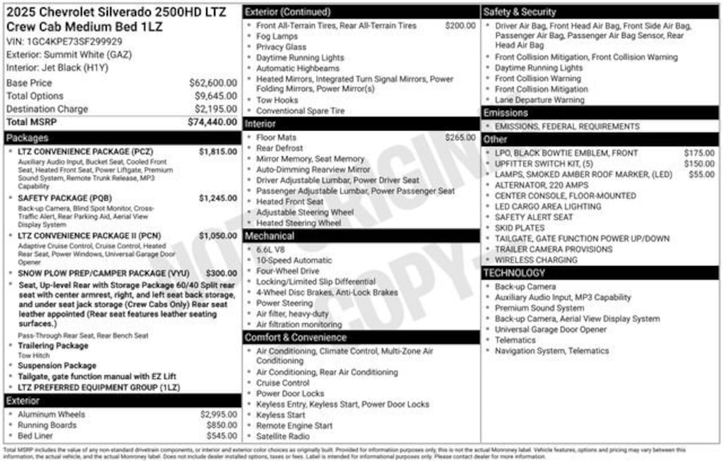 120-Volt Bed Mounted Power Outlet, 120-Volt Interior Power Outlet, 170 Amp Alternator, 2 Charge/Data USB Ports Inside Center Console, 220 Amp Alternator, 3.73 Rear Axle Ratio, 4-Wheel Disc Brakes, 4 Round Black Assist Steps (LPO), 6-Speaker Audio System, ABS brakes, Adaptive Cruise Control, Air Conditioning, All-Weather Floor Liners (LPO), AM/FM radio: SiriusXM with 360L, Apple CarPlay/Android Auto, Auto High-beam Headlights, Auto-Dimming Inside Rear-View Mirror, Automatic temperature control, Bed View Camera w/2 Trailer Camera Provisions, Black Chevytec Spray-On Bedliner, Bluetooth® For Phone, BOSE Premium 7-Speaker Sound System, Brake assist, Chevrolet Connected Access Capable, Chrome Door Handles, Chrome Mirror Caps, Color-Keyed Carpeting Floor Covering, Compass, Deep-Tinted Glass, Dual front impact airbags, Dual front side impact airbags, Electric Rear-Window Defogger, Electronic Cruise Control w/Set & Resume Speed, Electronic Stability Control, Emergency communication system: OnStar, EZ Lift Power Lock & Release Tailgate, Floor-Mounted Center Console, Front Black Bowtie Emblem (LPO), Front Bucket Seats, Front dual zone A/C, Front fog lights, Front LED Fog Lamps, Front Rain-Sensing Wipers, Front Rubberized Vinyl Floor Mats, Fully automatic headlights, HD Rear Vision Camera, HD Surround Vision, Heated 2nd Row Outboard Seats, Heated door mirrors, Heated Steering Wheel, Hitch Guidance w/Hitch View, Illuminated entry, In-Vehicle Trailering App System, Keyless Open & Start, LED Cargo Area Lighting, LED Smoked Amber Roof Marker Lamps, Low tire pressure warning, LTZ Convenience Package, LTZ Convenience Package II, Manual Tilt & Telescoping Steering Column, Occupant sensing airbag, OnStar Services Capable, Outside temperature display, Overhead airbag, Perf Leather-Appointed Front Outboard Seat Trim, Power Door Locks, Power door mirrors, Power Front Windows w/Driver Express Up/Down, Power Front Windows w/Passenger Express Up/Down, Power Rear Windows w/Express Down, Power Sliding Rear Window w/Defogger, Preferred Equipment Group 1LZ, Premium audio system: Chevrolet Infotainment 3 Premium, Push Button Start, Pwr Up/Down Tailgate Function w/Pwr Lock & Release, Radio: Chevrolet Infotainment 3 Premium System, Rain sensing wipers, Rear Cross Traffic Alert, Rear Rubberized Vinyl Floor Mats, Rear Wheelhouse Liners, Remote keyless entry, Remote Vehicle Starter System, Safety Alert Seat, Safety Package, SiriusXM w/360L Trial Subscription, Snow Plow Prep/Camper Package, Standard Tailgate, Steering Wheel Audio Controls, Steering wheel mounted audio controls, Suspension Package, Telescoping steering wheel, Tilt steering wheel, Traction control, Trailer Camera Provisions, Trailer Side Blind Zone Alert, Ultrasonic Front & Rear Park Assist, Unauthorized Entry Theft-Deterrent System, Universal Home Remote, Up-Level Rear Seat w/Storage Package, Variably intermittent wipers, Ventilated Driver & Front Passenger Seats, Wheels: 20 Aluminum High Gloss Black (LPO), Wheels: 20 Transit Aluminum, Wi-Fi Hotspot Capable, Wireless Charging, Wireless Phone Projection, Wrapped Steering Wheel, 6 Speakers, 720 Cold-Cranking Amps Heavy-Duty Battery, Alloy wheels, Auto-dimming door mirrors, Auto-dimming Rear-View mirror, Bumpers: chrome, Delay-off headlights, Driver door bin, Driver vanity mirror, Durabed Pickup Bed, Front anti-roll bar, Front Center Armrest w/Storage, Front reading lights, Front wheel independent suspension, Heated front seats, Heated steering wheel, Memory seat, Overhead console, Panic alarm, Passenger door bin, Passenger vanity mirror, Power driver seat, Power passenger seat, Power steering, Power windows, Rear reading lights, Rear seat center armrest, Rear step bumper, R Rebates listed are for zip code 48623. Must qualify for GMS