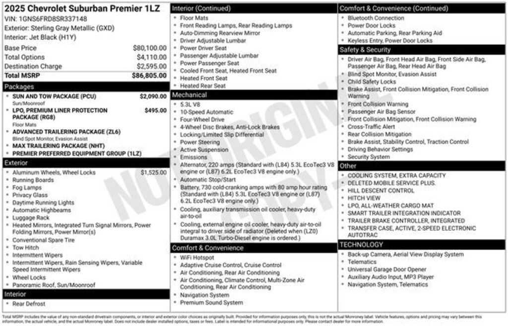 2-Speed Active Electronic AutoTrac Transfer Case, 3rd Row 60/40 Power-Folding Split-Bench, 4-Way Power Driver Lumbar Seat Adjuster, 4-Way Power Front Passenger Lumbar Seat Adjuster, 4-Wheel Disc Brakes, 8-Way Power Driver Seat Adjuster, 8-Way Power Front Passenger Seat Adjuster, ABS brakes, Advanced Trailering Package, Air Conditioning, AM/FM radio: SiriusXM with 360L, Apple CarPlay/Android Auto, Auto High-beam Headlights, Auto-Dimming Inside Rear-View Mirror, Auto-leveling suspension, Automatic temperature control, Brake assist, Chrome Mirror Caps, Dual Exhaust System, Dual front impact airbags, Dual front side impact airbags, Dual-Pane Power Panoramic Sunroof, Electronic Stability Control, Emergency communication system: OnStar Services capable, Exterior Parking Camera Rear, Extra Capacity Cooling System, Front dual zone A/C, Front fog lights, Front LED Fog Lamps, Fully automatic headlights, Garage door transmitter, Heated 2nd Row Outboard Seats, Heated Power-Adjustable Outside Mirrors, Heated rear seats, Heated Steering Wheel, Hill Descent Control, Illuminated entry, Integrated Trailer Brake Controller, LED Tail Lamps, Low tire pressure warning, Magnetic Ride Control Suspension, Max Trailering Package, Memory Settings, Occupant sensing airbag, Outside temperature display, Overhead airbag, Power Liftgate, Power Release 2nd Row Bucket Seats, Power-Sliding Center Floor Console, Preferred Equipment Group 1LZ, Radio data system, Radio: 17.7 Diagonal Advanced Color LCD Display, Rain sensing wipers, Rear air conditioning, Rear Power Liftgate, Rear window defroster, Rear window wiper, Remote keyless entry, Security system, Smart Trailer Integration Indicator, Speed control, Steering wheel memory, Steering wheel mounted audio controls, Telescoping steering wheel, Tilt steering wheel, Traction control, Universal Home Remote, Variably intermittent wipers, Ventilated front seats, Wireless Apple CarPlay/Wireless Android Auto, Wireless Phone Charging, 10 Speakers, 20 x 9 Polished Aluminum Wheels, 3.23 Rear Axle Ratio, 3rd row seats: split-bench, Adaptive suspension, Alloy wheels, Auto-dimming door mirrors, Auto-dimming Rear-View mirror, Bumpers: body-color, Compass, Delay-off headlights, Deleted Mobile Service Plus, Driver door bin, Driver vanity mirror, Four wheel independent suspension, Front anti-roll bar, Front Bucket Seats, Front Center Armrest, Front reading lights, Heated door mirrors, Heated front seats, Heated steering wheel, Memory seat, Navigation system: Google built-in compatibility (select service plan required, terms and limitations apply), Overhead console, Panic alarm, Passenger door bin, Passenger vanity mirror, Perforated Leather Seating Surfaces, Power door mirrors, Power driver seat, Power passenger seat, Power steering, Power windows, Rear anti-roll bar, Rear reading lights, Speed-sensing steering, Split folding rear seat, Spoiler, Tachometer, Trip computer, Turn signal indicator mirrors, Voltmeter, 2-Speed Active Electronic AutoTrac Transfer Case, 3rd Row 60/40 Power-Folding Split-Bench, 4-Way Power Driver Lumbar Seat Adjuster, 4-Way Power Front Passenger Lumbar Seat Adjuster, 4-Wheel Disc Brakes, 8-Way Power Driver Seat Adjuster, 8-Way Power Front Passenger Seat Adjuster, ABS brakes, Advanced Trailering Package, Air Conditioning, AM/FM radio: SiriusXM with 360L, Apple CarPlay/Android Auto, Auto High-beam Headlights, Auto-Dimming Inside Rear-View Mirror, Auto-leveling suspension, Automatic temperature control, Brake assist, Chrome Mirror Caps, Dual Exhaust System, Dual front impact airbags, Dual front side impact airbags, Dual-Pane Power Panoramic Sunroof, Electronic Stability Control, Emergency communication system: OnStar Services capable, Exterior Parking Camera
