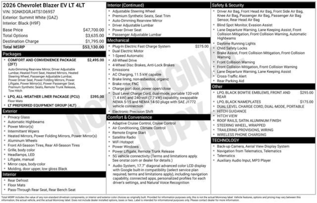 2-Way Front Passenger Power Lumbar Seat Adjuster, 2-Way Power Driver Lumbar Seat Adjuster, 4-Wheel Disc Brakes, 6-Speaker Audio System Feature, 6-Way Power Front Passenger Seat Adjuster, 8-Way Power Driver Seat Adjuster, ABS brakes, Air Conditioning, AM/FM radio: SiriusXM with 360L, Auto High-beam Headlights, Automatic temperature control, Brake assist, Compass, Dual front impact airbags, Dual front side impact airbags, Electronic Stability Control, Emergency communication system: OnStar and Chevrolet connected services capable, Evotex Seat Trim, Fully automatic headlights, Heated Steering Wheel, Hitch Guidance, Hitch View, Illuminated entry, Inside Rear-View Auto-Dimming Mirror, Knee airbag, Low tire pressure warning, Occupant sensing airbag, Outside temperature display, Overhead airbag, Power door mirrors, Power-Adjustable Power-Folding Heated Mirrors, Preferred Equipment Group 4LT, Radio: 17.7 Diagonal Advanced Color LCD Display, Rear window defroster, Rear window wiper, Remote keyless entry, Security system, Speed control, Steering wheel mounted audio controls, Telescoping steering wheel, Tilt steering wheel, Traction control, Variably intermittent wipers, Wheels: 19 Machined-Face Aluminum, Wireless Phone Charging, Wrapped Steering Wheel, 6 Speakers, 6-Way Manual Driver Seat Adjuster, 6-Way Manual Front Passenger Seat Adjuster, Alloy wheels, Bumpers: body-color, Cloth Seat Trim, Delay-off headlights, Driver door bin, Driver vanity mirror, Four wheel independent suspension, Front anti-roll bar, Front Bucket Seats, Front Center Armrest, Front reading lights, Navigation System, Overhead console, Panic alarm, Passenger door bin, Passenger vanity mirror, Power steering, Power windows, Rear anti-roll bar, Rear reading lights, Rear seat center armrest, Satin Aluminum Finish Roof Rails, Split folding rear seat, Spoiler, Trip computer, 2-Way Front Passenger Power Lumbar Seat Adjuster, 2-Way Power Driver Lumbar Seat Adjuster, 4-Wheel Disc Brakes, 6-Speaker Audio System Feature, 6-Way Power Front Passenger Seat Adjuster, 8-Way Power Driver Seat Adjuster, ABS brakes, Air Conditioning, AM/FM radio: SiriusXM with 360L, Auto High-beam Headlights, Automatic temperature control, Brake assist, Compass, Dual front impact airbags, Dual front side impact airbags, Electronic Stability Control, Emergency communication system: OnStar and Chevrolet connected services capable, Evotex Seat Trim, Fully automatic headlights, Heated Steering Wheel, Hitch Guidance, Hitch View, Illuminated entry, Inside Rear-View Auto-Dimming Mirror, Knee airbag, Low tire pressure warning, Occupant sensing airbag, Outside temperature display, Overhead airbag, Power door mirrors, Power-Adjustable Power-Folding Heated Mirrors, Preferred Equipment Group 4LT, Radio: 17.7 Diagonal Advanced Color LCD Display, Rear window defroster, Rear window wiper, Remote keyless entry, Security system, Speed control, Steering wheel mounted audio controls, Telescoping steering wheel, Tilt steering wheel, Traction control, Variably intermittent wipers, Wheels: 19 Machined-Face Aluminum, Wireless Phone Charging, Wrapped Steering Wheel. Rebates listed are for zip code 48623. Must qualify for GMS Employee purchase plan$1000 - Customer Cash. Exp. 04/30/2026