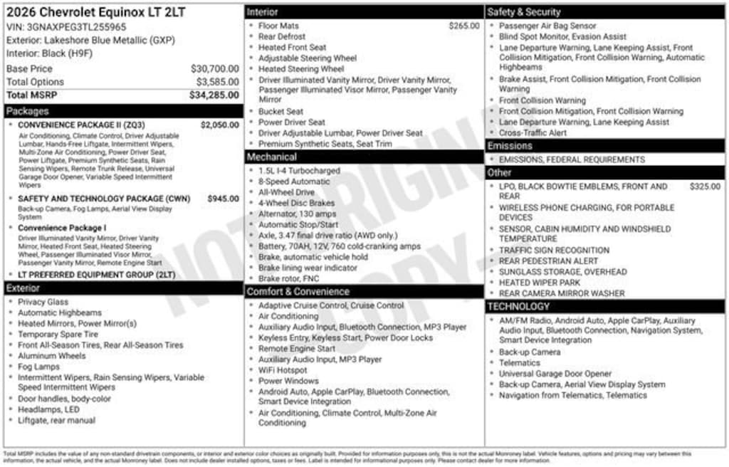2-Way Power Driver Lumbar Control Seat Adjuster, 3.47 Final Drive Axle Ratio, 4-Wheel Disc Brakes, 6 Speakers, ABS brakes, Air Conditioning, All-Weather Floor Liners (LPO), Alloy wheels, AM/FM radio: SiriusXM, Auto High-beam Headlights, AutoSense Hands-Free Power Programmable Liftgate, Brake assist, Bumpers: body-color, Cabin Humidity & Windshield Sensor, Cloth Seat Trim, Compass, Convenience Package II, Delay-off headlights, Driver 6-Way Manual Seat Adjuster, Driver 8-Way Power Seat Adjuster, Driver door bin, Driver vanity mirror, Dual front impact airbags, Dual front side impact airbags, Dual-Zone Automatic Climate Control, Electronic Stability Control, Emergency communication system: OnStar and Chevrolet connected services capable, Evotex Seat Trim, Four wheel independent suspension, Front & Rear Black Bowtie Emblems (LPO), Front anti-roll bar, Front Bucket Seats, Front Center Armrest, Front Fog Lamps, Front Passenger 4-Way Manual Seat Adjuster, Front reading lights, Fully automatic headlights, HD Surround Vision, Heated door mirrors, Heated Driver & Front Passenger Seats, Heated front seats, Heated steering wheel, Heated Wiper Park, Illuminated entry, Intermittent Front Rain-Sensing Wipers, Low tire pressure warning, Navigation System, Occupant sensing airbag, Outside temperature display, Overhead airbag, Overhead console, Overhead Sunglass Storage, Panic alarm, Passenger door bin, Passenger vanity mirror, Power door mirrors, Power steering, Power windows, Preferred Equipment Group 2LT, Premium audio system: Chevrolet Infotainment 3, Programmable Universal Home Remote, Radio data system, Radio: 11.3 Diagonal Advanced Color LCD Display, Rear anti-roll bar, Rear Camera Mirror Washer, Rear Pedestrian Alert, Rear reading lights, Rear seat center armrest, Rear window defroster, Rear window wiper, Remote keyless entry, Safety & Technology Package, Second Row All-Weather Mat (LPO), Security system, SiriusXM w/360L Trial Subscription, Speed control, Speed-sensing steering, Split folding rear seat, Spoiler, Steering wheel mounted audio controls, Tachometer, Telescoping steering wheel, Tilt steering wheel, Traction control, Traffic Sign Recognition, Trip computer, Variably intermittent wipers, Wheels: 17 Grazen Metallic Machined-Face Aluminum, Wireless Phone Charging for Portable Devices.