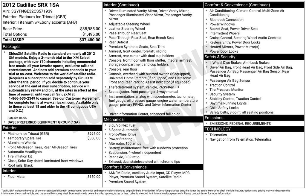 Platinum Ice Tricoat 2012 Cadillac SRX 4D Sport Utility 3.6L V6 SIDI DOHC VVT FWD 6-Speed Automatic
