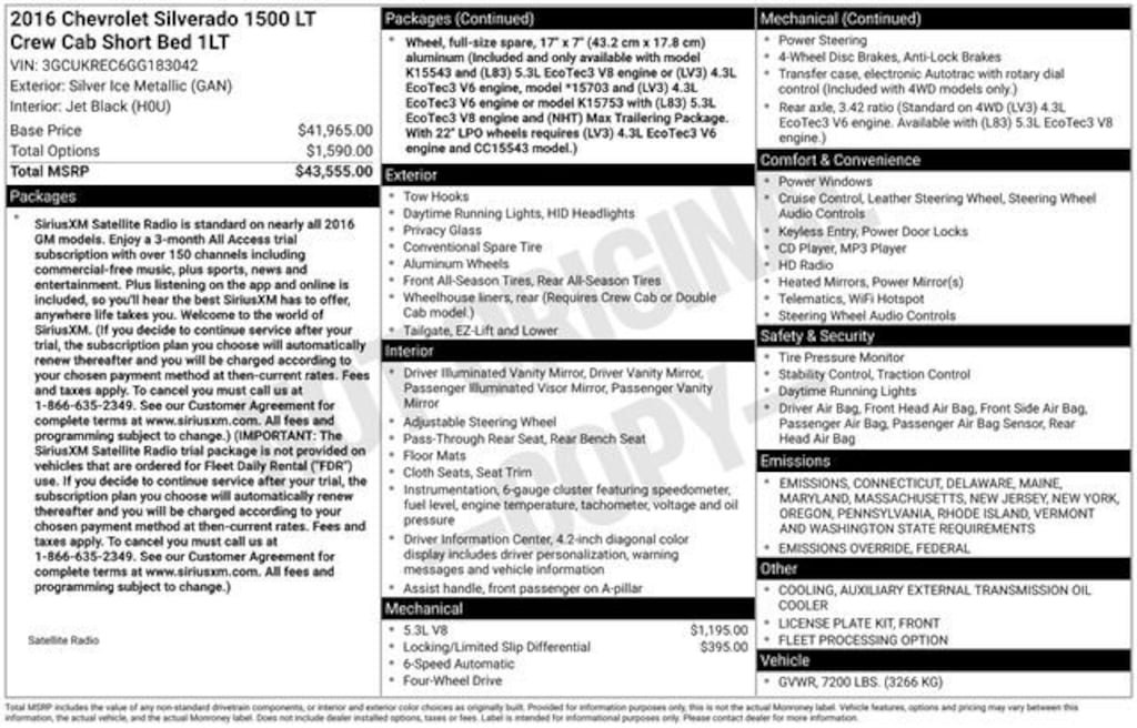 Recent Arrival!*** WE DELIVER ***Silver Ice Metallic 2016 Chevrolet Silverado 1500 LT LT1 EcoTec3 5.3L V8 6-Speed Automatic Electronic with Overdrive 4WD 4D Crew Cab150 Amp Alternator, 4-Wheel Disc Brakes, 4.2 Diagonal Color Display Driver Info Center, 40/20/40 Front Split Bench Seat, 6 Speaker Audio System, 6 Speakers, ABS brakes, Air Conditioning, Alloy wheels, AM/FM radio: SiriusXM, Auxiliary External Transmission Oil Cooler, Bluetooth® For Phone, Body Color Bodyside Moldings, Body Color Door Handles, Body-Color Mirror Caps, Body-Color Power Adjustable Heated Outside Mirrors, Bodyside moldings, Brake assist, CD player, Cloth Seat Trim, Color-Keyed Carpeting w/Rubberized Vinyl Floor Mats, Compass, Deep-Tinted Glass, Delay-off headlights, Driver & Front Passenger Illuminated Vanity Mirrors, Driver door bin, Driver vanity mirror, Dual front impact airbags, Dual front side impact airbags, Electronic Stability Control, Emergency communication system: OnStar Guidance, EZ Lift & Lower Tailgate, Front anti-roll bar, Front Center Armrest w/Storage, Front Chrome Bumper, Front License Plate Kit, Front reading lights, Front wheel independent suspension, Fully automatic headlights, HD Radio, Heated door mirrors, Heavy-Duty Rear Locking Differential, High-Intensity Discharge Headlights, Illuminated entry, Leather Wrapped Steering Wheel w/Cruise Controls, Low tire pressure warning, Manual Tilt Wheel Steering Column, Occupant sensing airbag, OnStar 6 Months Guidance Plan, OnStar w/4G LTE, Outside temperature display, Overhead airbag, Overhead console, Panic alarm, Passenger door bin, Passenger vanity mirror, Power door mirrors, Power steering, Power windows, Power Windows w/Driver Express Up, Premium audio system: Chevrolet MyLink, Radio data system, Radio: AM/FM 8 Diagonal Color Touch Screen, Rear 60/40 Folding Bench Seat (Folds Up), Rear Chrome Bumper, Rear reading lights, Rear seat center armrest, Rear step bumper, Rear Wheelhouse Liners, Remote Keyless Entry, Remote keyless entry, Remote Locking Tailgate, Single Slot CD/MP3 Player, SiriusXM Satellite Radio, Speed control, Speed-sensing steering, Split folding rear seat, Steering Wheel Audio Controls, Steering wheel mounted audio controls, Tachometer, Thin Profile LED Fog Lamps, Tilt steering wheel, Traction control, Trailering Package, Trip computer, Variably intermittent wipers, Voltmeter, 150 Amp Alternator, 4-Wheel Disc Brakes, 4.2 Diagonal Color Display Driver Info Center, 40/20/40 Front Split Bench Seat, 6 Speaker Audio System, 6 Speakers, ABS brakes, Air Conditioning, Alloy wheels, AM/FM radio: SiriusXM, Auxiliary External Transmission Oil Cooler, Bluetooth® For Phone, Body Color Bodyside Moldings, Body Color Door Handles, Body-Color Mirror Caps, Body-Color Power Adjustable Heated Outside Mirrors, Bodyside moldings, Brake assist, CD player, Cloth Seat Trim, Color-Keyed Carpeting w/Rubberized Vinyl Floor Mats, Compass, Deep-Tinted Glass, Delay-off headlights, Driver & Front Passenger Illuminated Vanity Mirrors, Driver door bin, Driver vanity mirror, Dual front impact airbags, Dual front side impact airbags, Electronic Stability Control, Emergency communication system: OnStar Guidance, EZ Lift & Lower Tailgate, Front anti-roll bar, Front Center Armrest w/Storage, Front Chrome Bumper, Front License Plate Kit, Front reading lights, Front wheel independent suspension, Fully automatic headlights, HD Radio, Heated door mirrors, Heavy-Duty Rear Locking Differential, High-Intensity Discharge Headlights, Illuminated entry, Leather Wrapped Steering Wheel w/Cruise Controls, Low tire pressure warning, Manual Tilt Wheel Steering Column, Occupant sensing airbag, OnStar 6 Months Guidance Plan, OnStar w/4G LTE, Outside temperature display, Overhead airbag, Overhead console, Panic alarm, Passenger door bin, Passenger vanity mirror, Power door mirrors, Power steering, Power windows, Power Windows w/Driver Express Up, Premium audio system: Chevrolet MyLink, Radio data sy