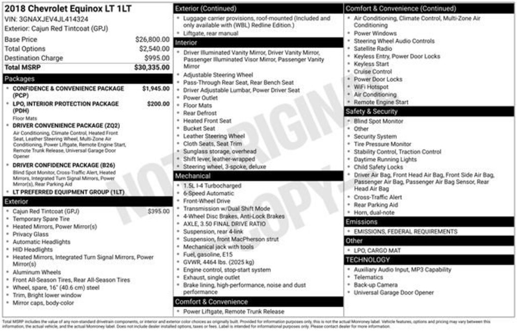 Recent Arrival!*** WE DELIVER ***Cajun Red Tintcoat 2018 Chevrolet Equinox LT 4D Sport Utility 1.5L DOHC 6-Speed Automatic Electronic with Overdrive FWD17 Aluminum Wheels, 3-Spoke Leather-Wrapped Steering Wheel, 3.50 Final Drive Axle Ratio, 4-Wheel Disc Brakes, 6 Speaker Audio System Feature, 6 Speakers, 8-Way Power Driver Seat Adjuster, ABS brakes, Air Conditioning, All-Weather Floor Mats, Alloy wheels, AM/FM radio: SiriusXM, Apple CarPlay/Android Auto, Bluetooth® For Phone, Brake assist, Bumpers: body-color, Cargo Mat, Compass, Confidence & Convenience Package, Delay-off headlights, Driver Confidence Package, Driver Convenience Package, Driver door bin, Driver vanity mirror, Dual front impact airbags, Dual front side impact airbags, Dual Zone Automatic Climate Control, Electronic Stability Control, Emergency communication system: OnStar and Chevrolet connected services capable, Exterior Parking Camera Rear, Four wheel independent suspension, Front anti-roll bar, Front Bucket Seats, Front Center Armrest, Front Passenger 4-Way Manual Seat Adjuster, Front reading lights, Fully automatic headlights, Heated door mirrors, Heated Driver & Front Passenger Seats, High-Intensity Discharge Headlights, Illuminated entry, Interior Protection Package (LPO), Lane Change Alert w/Side Blind Zone Alert, Leather Shift Knob, Low tire pressure warning, Occupant sensing airbag, Outside Heated Power-Adjustable Mirrors, Outside temperature display, Overhead airbag, Overhead console, Panic alarm, Passenger door bin, Passenger vanity mirror, Power door mirrors, Power driver seat, Power steering, Power windows, Preferred Equipment Group 1LT, Premium audio system: Chevrolet MyLink, Premium Cloth Seat Trim, Radio data system, Radio: Chevrolet MyLink AM/FM Stereo, Rear anti-roll bar, Rear Cross Traffic Alert, Rear Park Assist w/Audible Warning, Rear Power Liftgate, Rear reading lights, Rear seat center armrest, Rear window defroster, Rear window wiper, Remote keyless entry, Remote Vehicle Starter System, Security system, SiriusXM Satellite Radio, Speed control, Speed-sensing steering, Split folding rear seat, Spoiler, Steering wheel mounted audio controls, Tachometer, Telescoping steering wheel, Tilt steering wheel, Traction control, Trip computer, Universal Home Remote, USB Port & Auxiliary Input Jack, Variably intermittent wipers.