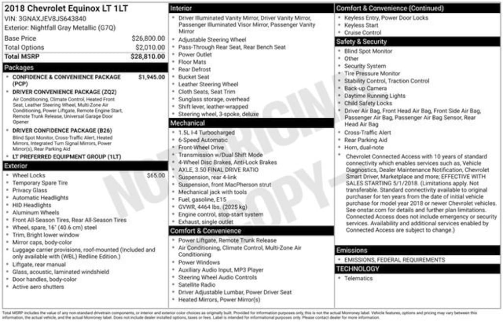 Recent Arrival! Clean CARFAX.*** WE DELIVER ***Nightfall Gray Metallic 2018 Chevrolet Equinox LT 1.5L DOHC 6-Speed Automatic Electronic with Overdrive FWD 4D Sport Utility17 Aluminum Wheels, 3-Spoke Leather-Wrapped Steering Wheel, 3.50 Final Drive Axle Ratio, 4-Wheel Disc Brakes, 6 Speaker Audio System Feature, 6 Speakers, 8-Way Power Driver Seat Adjuster, ABS brakes, Air Conditioning, Alloy wheels, AM/FM radio: SiriusXM, Apple CarPlay/Android Auto, Bluetooth® For Phone, Brake assist, Bumpers: body-color, Compass, Confidence & Convenience Package, Delay-off headlights, Driver Confidence Package, Driver Convenience Package, Driver door bin, Driver vanity mirror, Dual front impact airbags, Dual front side impact airbags, Dual Zone Automatic Climate Control, Electronic Stability Control, Emergency communication system: OnStar and Chevrolet connected services capable, Exterior Parking Camera Rear, Four wheel independent suspension, Front anti-roll bar, Front Bucket Seats, Front Center Armrest, Front Passenger 4-Way Manual Seat Adjuster, Front reading lights, Fully automatic headlights, Heated door mirrors, Heated Driver & Front Passenger Seats, High-Intensity Discharge Headlights, Illuminated entry, Lane Change Alert w/Side Blind Zone Alert, Leather Shift Knob, Low tire pressure warning, Occupant sensing airbag, Outside Heated Power-Adjustable Mirrors, Outside temperature display, Overhead airbag, Overhead console, Panic alarm, Passenger door bin, Passenger vanity mirror, Power door mirrors, Power driver seat, Power steering, Power windows, Preferred Equipment Group 1LT, Premium audio system: Chevrolet MyLink, Premium Cloth Seat Trim, Radio data system, Radio: Chevrolet MyLink AM/FM Stereo, Rear anti-roll bar, Rear Cross Traffic Alert, Rear Park Assist w/Audible Warning, Rear Power Liftgate, Rear reading lights, Rear seat center armrest, Rear window defroster, Rear window wiper, Remote keyless entry, Remote Vehicle Starter System, Security system, Set of 4 Wheel Locks (LPO), SiriusXM Satellite Radio, Speed control, Speed-sensing steering, Split folding rear seat, Spoiler, Steering wheel mounted audio controls, Tachometer, Telescoping steering wheel, Tilt steering wheel, Traction control, Trip computer, Universal Home Remote, USB Port & Auxiliary Input Jack, Variably intermittent wipers.