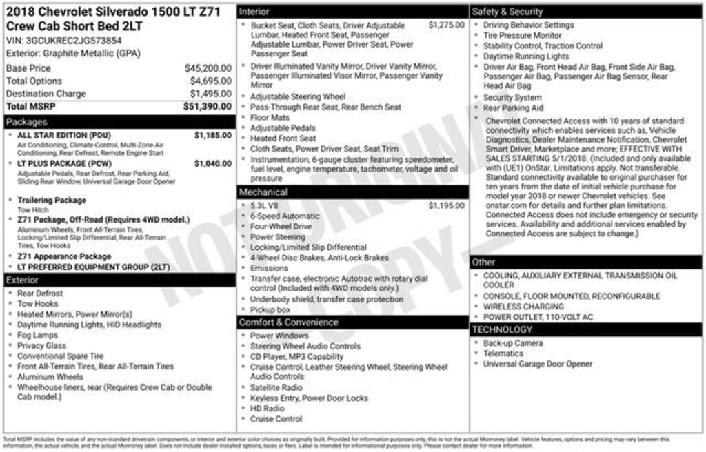 Recent Arrival!*** WE DELIVER ***Graphite Metallic 2018 Chevrolet Silverado 1500 LT LT2 4D Crew Cab EcoTec3 5.3L V8 6-Speed Automatic Electronic with Overdrive 4WD10-Way Power Driver's Seat Adjuster, 110-Volt AC Power Outlet, 150 Amp Alternator, 4-Wheel Disc Brakes, 4.2 Diagonal Color Display Driver Info Center, 40/20/40 Front Split Bench Seat, 6 Speaker Audio System, 6 Speakers, ABS brakes, Air Conditioning, All Star Edition, Alloy wheels, AM/FM radio: SiriusXM, Auxiliary External Transmission Oil Cooler, Bluetooth® For Phone, Body Color Bodyside Moldings, Body-Color Door Handles, Body-Color Mirror Caps, Body-Color Power Adjustable Heated Outside Mirrors, Bodyside moldings, Brake assist, CD player, Chevrolet Connected Access, Chevrolet w/4G LTE, Cloth Seat Trim, Color-Keyed Carpeting w/Rubberized Vinyl Floor Mats, Compass, Deep-Tinted Glass, Delay-off headlights, Driver & Front Passenger Illuminated Vanity Mirrors, Driver door bin, Driver vanity mirror, Dual front impact airbags, Dual front side impact airbags, Dual-Zone Automatic Climate Control, Electric Rear-Window Defogger, Electronic Stability Control, Exterior Parking Camera Rear, EZ Lift & Lower Tailgate, Floor Mounted Console, Front anti-roll bar, Front Center Armrest w/Storage, Front Chrome Bumper, Front Power Reclining Bucket Seats, Front reading lights, Front wheel independent suspension, Fully automatic headlights, HD Radio, Heated door mirrors, Heated Driver & Front Passenger Seats, Heavy-Duty Rear Locking Differential, High-Intensity Discharge Headlights, Illuminated entry, Leather Wrapped Steering Wheel w/Cruise Controls, Low tire pressure warning, LT Plus Package, Manual Tilt Wheel Steering Column, Manual Tilt/Telescoping Steering Column, Occupant sensing airbag, OnStar & Chevrolet Connected Services Capable, Outside temperature display, Overhead airbag, Overhead console, Panic alarm, Passenger door bin, Passenger vanity mirror, Power Adjustable Pedals, Power door mirrors, Power Sliding Rear Window, Power steering, Power windows, Power Windows w/Driver Express Up, Premium audio system: Chevrolet MyLink, Radio data system, Radio: AM/FM 8 Diagonal Color Touch Screen, Rear 60/40 Folding Bench Seat (Folds Up), Rear Chrome Bumper, Rear reading lights, Rear seat center armrest, Rear step bumper, Rear Wheelhouse Liners, Remote Keyless Entry, Remote keyless entry, Remote Locking Tailgate, Remote Vehicle Starter System, Single Slot CD/MP3 Player, SiriusXM Satellite Radio, Speed control, Speed-sensing steering, Split folding rear seat, Steering Wheel Audio Controls, Steering wheel mounted audio controls, Tachometer, Theft Deterrent System (Unauthorized Entry), Thin Profile LED Fog Lamps, Tilt steering wheel, Traction control, Trailering Package, Trip computer, Ultrasonic Rear Park Assist, Universal Home Remote, Variably intermittent wipers, Voltmeter, Wireless Charging.