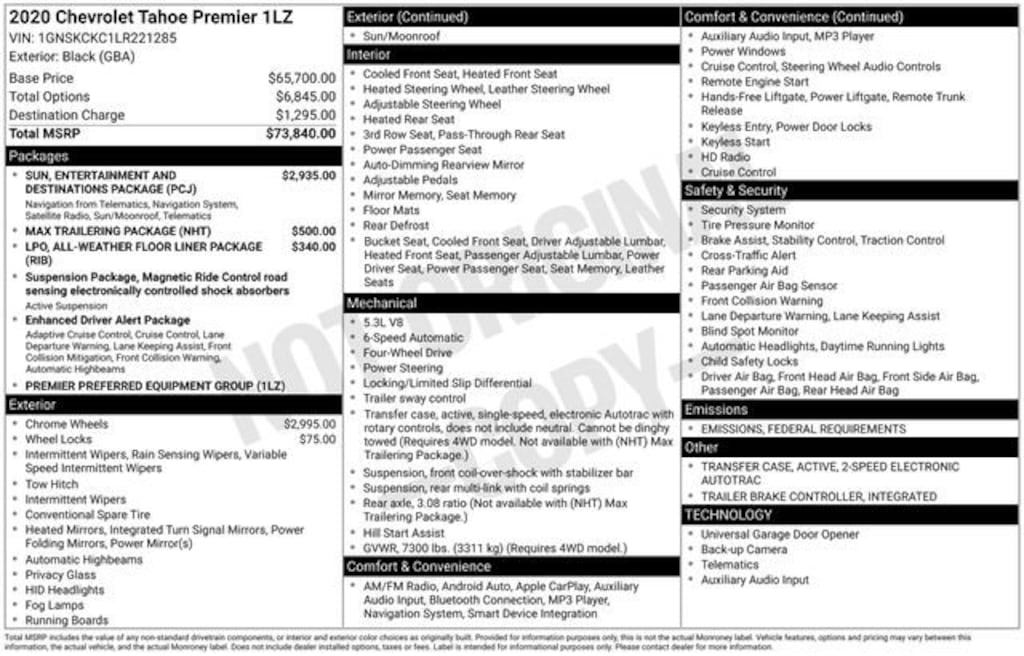 *** WE DELIVER ***Black 2020 Chevrolet Tahoe Premier 4D Sport Utility EcoTec3 5.3L V8 6-Speed Automatic Electronic with Overdrive 4WD10 Speakers, 1st & 2nd Row Color-Keyed Carpeted Floor Mats, 3rd Row 60/40 Power Fold Split-Bench, 3rd row seats: split-bench, 4-Wheel Antilock Disc Brakes w/Brake Assist, 4-Wheel Disc Brakes, 5 12-Volt Auxiliary Power Outlets, ABS brakes, Adaptive suspension, Adjustable pedals, Air Conditioning, All-Weather Floor Liner Package (LPO), Alloy wheels, AM/FM radio: SiriusXM, Apple CarPlay/Android Auto, Auto High-beam Headlights, Auto-dimming door mirrors, Auto-Dimming Inside Rear-View Mirror, Auto-dimming Rear-View mirror, Auto-leveling suspension, Automatic Emergency Braking, Automatic temperature control, Black Assist Steps w/Chrome Accent Strip, Bluetooth for Phone, Bodyside moldings, Bose Centerpoint Premium 10-Speaker Surround Sound, Brake assist, Bumpers: body-color, Cargo Net, CD player, Color-Keyed Carpeting Floor Covering, Compass, Delay-off headlights, Driver door bin, Driver Inboard & Front Passenger Airbags, Driver vanity mirror, Dual front impact airbags, Dual front side impact airbags, Electronic Cruise Control w/Set & Resume Speed, Electronic Stability Control, Emergency communication system: OnStar and Chevrolet connected services capable, Enhanced Driver Alert Package (Y86), Exterior Parking Camera Rear, Floor Console, Fog Lamps, Forward Collision Alert, Front & Rear Park Assist, Front anti-roll bar, Front Bucket Seats, Front Center Armrest, Front dual zone A/C, Front fog lights, Front Heated Reclining Bucket Seats, Front Passenger 6-Way Power Seat Adjuster, Front reading lights, Front wheel independent suspension, Fully automatic headlights, Garage door transmitter, Hands Free Power Liftgate, HD Radio, Heated & Ventilated Driver & Front Passenger Seats, Heated 2nd Row Outboard Seats, Heated door mirrors, Heated front seats, Heated Leather Wrapped Steering Wheel, Heated rear seats, Heated steering wheel, High-Intensity Discharge Headlights, Illuminated entry, Integrated Trailer Brake Controller, IntelliBeam Headlamps, Lane Change Alert w/Side Blind Zone Alert, Lane Keep Assist w/Lane Departure Warning, Leather steering wheel, Low tire pressure warning, Magnetic Ride Control Suspension Package, Max Trailering Package, Memory seat, Memory Settings, Navigation System, Occupant sensing airbag, Outside temperature display, Overhead airbag, Overhead console, Panic alarm, Passenger door bin, Passenger vanity mirror, Passive Entry System, Pedal memory, Perforated Leather-Appointed Seat Trim, Power door mirrors, Power driver seat, Power Liftgate, Power passenger seat, Power Release 2nd Row Bucket Seats, Power steering, Power Sunroof, Power Tilt & Telescopic Steering Column, Power windows, Power-Adjustable Accelerator & Brake Pedals, Power-Folding Heated Outside Mirrors, Preferred Equipment Group 1LZ, Premium audio system: Chevrolet MyLink, Push Button Keyless Start, Radio: Chevrolet Infotainment AM/FM Stereo w/Nav, Rain sensing wipers, Rear air conditioning, Rear anti-roll bar, Rear Cross Traffic Alert, Rear reading lights, Rear Seat Blu-Ray/DVD Entertainment System, Rear window defroster, Rear window wiper, Remote Keyless Entry, Remote keyless entry, Remote Vehicle Start, Roof-Mounted Luggage Rack Side Rails, Security system, Set of 4 Wheel Locks (LPO), Single-Slot CD/MP3 Player, SiriusXM NavTraffic, SiriusXM Radio, Speed control, Speed-sensing steering, Split folding rear seat, Spoiler, Steering wheel memory, Steering wheel mounted audio controls, Sun, Entertainment & Destinations Package, Tachometer, Telescoping steering wheel, Tilt steering wheel, Traction control, Trip computer, Turn signal indicator mirrors, Universal Home Remote, Variably intermittent wipers, Ventilated front seats, Voltmeter, Wheels: 20 x 9 Polished-Aluminum, Wheels: 22 x 9 6-Spk Chrome Multi-Feature Design, Wireless Charging.