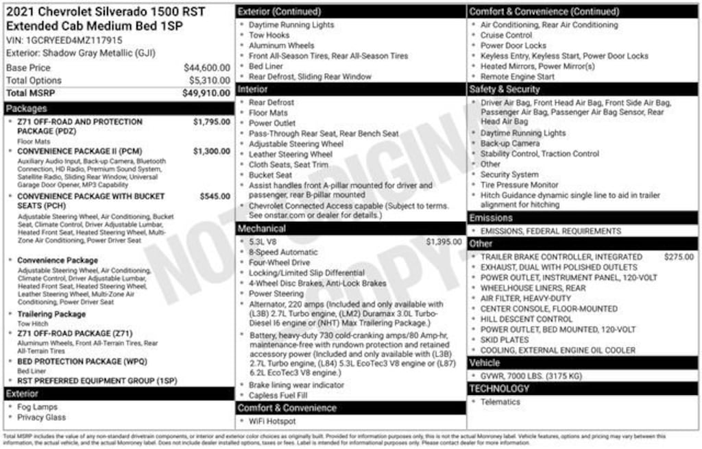Local Trade, Non Smoker, 172 point inspection certified, 1st oil change free with purchase, 2 Key Fobs, 10-Way Power Driver Seat w/Lumbar, 12-Volt Rear Auxiliary Power Outlet, 120-Volt Bed Mounted Power Outlet, 120-Volt Instrument Panel Power Outlet, 170 Amp Alternator, 2 USB Ports, 2 USB Ports (First Row), 220 Amp Alternator, 3.23 Rear Axle Ratio, 4-Wheel Disc Brakes, 4.2 Diagonal Color Display Driver Info Center, 40/20/40 Front Split-Bench Seat, 4G LTE Wi-Fi Hot Spot Capable, 6 Speakers, 6-Speaker Audio System, ABS brakes, Air Conditioning, All-Star Edition, All-Weather Floor Liner (LPO) (AAK), Alloy wheels, AM/FM radio: SiriusXM, Apple CarPlay/Android Auto, Auto-Locking Rear Differential, Automatic temperature control, Auxiliary External Transmission Oil Cooler, Bed Protection Package, Bluetooth® For Phone, Body Color Grille, Brake assist, Bumpers: body-color, Chevrolet Connected Access Capable, Chevytec Spray-On Black Bedliner, Cloth Seat Trim, Color-Keyed Carpeting Floor Covering, Compass, Convenience Package, Convenience Package II, Convenience Package w/Buckets Seats, Deep-Tinted Glass, Delay-off headlights, Driver door bin, Driver vanity mirror, Dual Exhaust w/Black Exhaust Tips, Dual Exhaust w/Polished Outlets, Dual front impact airbags, Dual front side impact airbags, Dual-Zone Automatic Climate Control, Electric Rear-Window Defogger, Electrical Lock Control Steering Column, Electronic Cruise Control, Electronic Stability Control, External Engine Oil Cooler, EZ Lift Power Lock & Release Tailgate, Floor Mounted Center Console, Front anti-roll bar, Front Bucket Seats, Front Center Armrest w/Storage, Front dual zone A/C, Front fog lights, Front Frame-Mounted Black Recovery Hooks, Front LED Fog Lamps, Front reading lights, Front Rubberized Vinyl Floor Mats, Front wheel independent suspension, Fully automatic headlights, HD Radio, HD Rear Vision Camera, Heated door mirrors, Heated Driver & Front Outboard Passenger Seats, Heated front seats, Heated Steering Wheel, Heated steering wheel, Heavy Duty Suspension, Heavy-Duty Air Filter, High Gloss Black Mirror Caps, Hill Descent Control, Hitch Guidance, Illuminated entry, Integrated Trailer Brake Controller, Keyless Open & Start, Leather Wrapped Steering Wheel, LED Cargo Area Lighting, Low tire pressure warning, Manual Tilt/Telescoping Steering Column, Occupant sensing airbag, Off-Road Suspension, OnStar & Chevrolet Connected Services Capable, Outside temperature display, Overhead airbag, Overhead console, Panic alarm, Passenger door bin, Passenger vanity mirror, Power Door Locks, Power door mirrors, Power driver seat, Power Front Windows w/Driver Express Up/Down, Power Front Windows w/Passenger Express Down, Power Rear Windows w/Express Down, Power Sliding Rear Window w/Rear Defogger, Power steering, Power windows, Preferred Equipment Group 1SP, Premium audio system: Chevrolet Infotainment 3, Premium Bose 7-Speaker Sound System, Radio data system, Radio: Chevrolet Infotainment 3 Plus System, Radio: Chevrolet Infotainment 3 System, Rear 60/40 Folding Bench Seat (Folds Up), Rear Dual USB Charging-Only Ports, Rear reading lights, Rear Rubberized-Vinyl Floor Mats, Rear step bumper, Rear Vision Camera, Rear Wheelhouse Liners, Rear window defroster, Remote keyless entry, Remote Vehicle Starter System, Security system, SiriusXM Radio, SiriusXM w/360L, Speed control, Speed-sensing steering, Split folding rear seat, Standard Tailgate, Steering Wheel Audio Controls, Steering wheel mounted audio controls, Tachometer, Telescoping steering wheel, Theft Deterrent System (Unauthorized Entry), Tilt steering wheel, Traction control, Trailering Package, Trip computer, Universal Home Remote, Variably intermittent wipers, Voltmeter, Wheels: 18 x 8.5