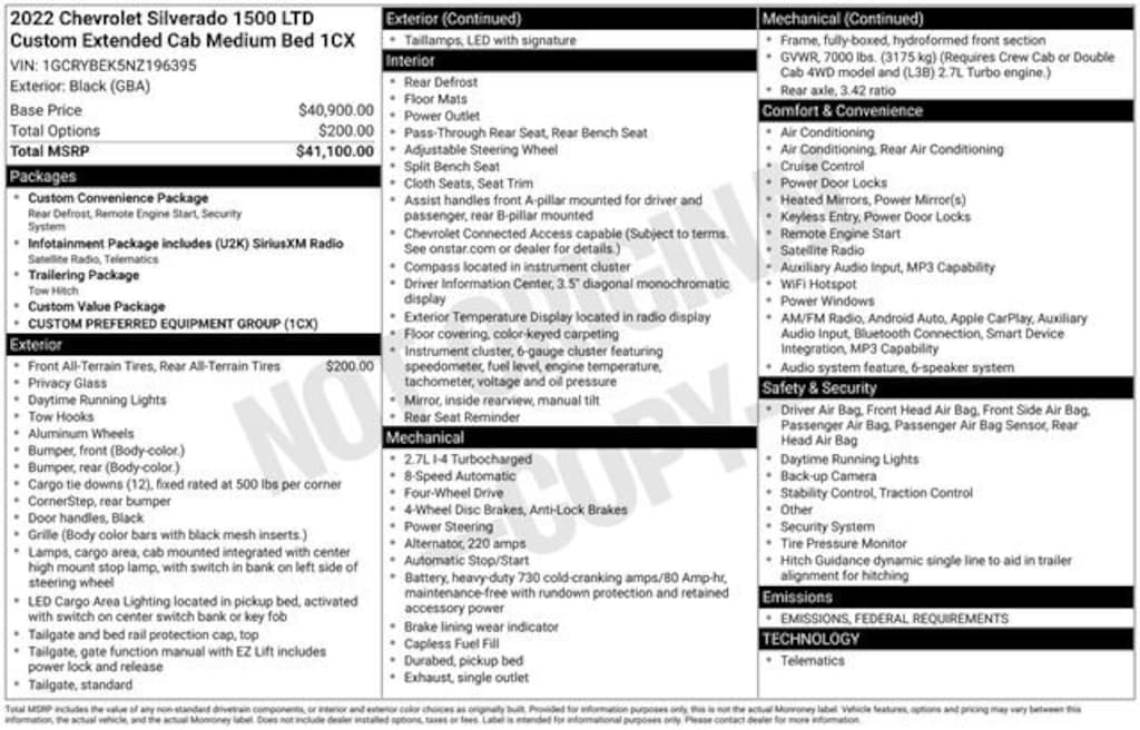 Recent Arrival! Odometer is 9704 miles below market average!*** WE DELIVER ***Black 2022 Chevrolet Silverado 1500 LTD Custom Double Cab 2.7L Turbo 8-Speed Automatic 4WD3.42 Rear Axle Ratio, 3.5 Monochromatic Display Driver Info Center, 4-Wheel Disc Brakes, 40/20/40 Front Split Bench Seat, 6 Speakers, 6-Speaker Audio System, ABS brakes, Air Conditioning, Alloy wheels, AM/FM radio: SiriusXM, Apple CarPlay/Android Auto, Bluetooth® For Phone, Body Color Grille, Brake assist, Bumpers: body-color, Chevrolet Connected Access Capable, Cloth Seat Trim, Color-Keyed Carpeting Floor Covering, Compass, Custom Convenience Package, Custom Value Package, Deep-Tinted Glass, Delay-off headlights, Driver door bin, Driver vanity mirror, Dual front impact airbags, Dual front side impact airbags, Electric Rear-Window Defogger, Electronic Cruise Control, Electronic Stability Control, EZ Lift Power Lock & Release Tailgate, Front anti-roll bar, Front Center Armrest w/Storage, Front Frame-Mounted Black Recovery Hooks, Front reading lights, Front Rubberized Vinyl Floor Mats, Front wheel independent suspension, Fully automatic headlights, Heated door mirrors, Heavy Duty Suspension, Hitch Guidance, Illuminated entry, Infotainment Package, LED Cargo Area Lighting, Low tire pressure warning, Manual Tilt Wheel Steering Column, Occupant sensing airbag, OnStar & Chevrolet Connected Services Capable, Outside temperature display, Overhead airbag, Overhead console, Panic alarm, Passenger door bin, Passenger vanity mirror, Power Door Locks, Power door mirrors, Power Front Windows w/Driver Express Up/Down, Power Front Windows w/Passenger Express Down, Power Rear Windows w/Express Down, Power steering, Power windows, Preferred Equipment Group 1CX, Premium audio system: Chevrolet Infotainment 3, Radio data system, Radio: Chevrolet Infotainment 3 System, Rear 60/40 Folding Bench Seat (Folds Up), Rear reading lights, Rear Rubberized-Vinyl Floor Mats, Rear step bumper, Rear window defroster, Remote Keyless Entry, Remote keyless entry, Remote Vehicle Starter System, Security system, SiriusXM Radio, Speed control, Speed-sensing steering, Split folding rear seat, Standard Tailgate, Tachometer, Theft Deterrent System (Unauthorized Entry), Tilt steering wheel, Traction control, Trailering Package, Trip computer, Variably intermittent wipers, Voltmeter, Wheels: 20 x 9 Bright Silver Painted Aluminum, Wi-Fi Hot Spot Capable.
