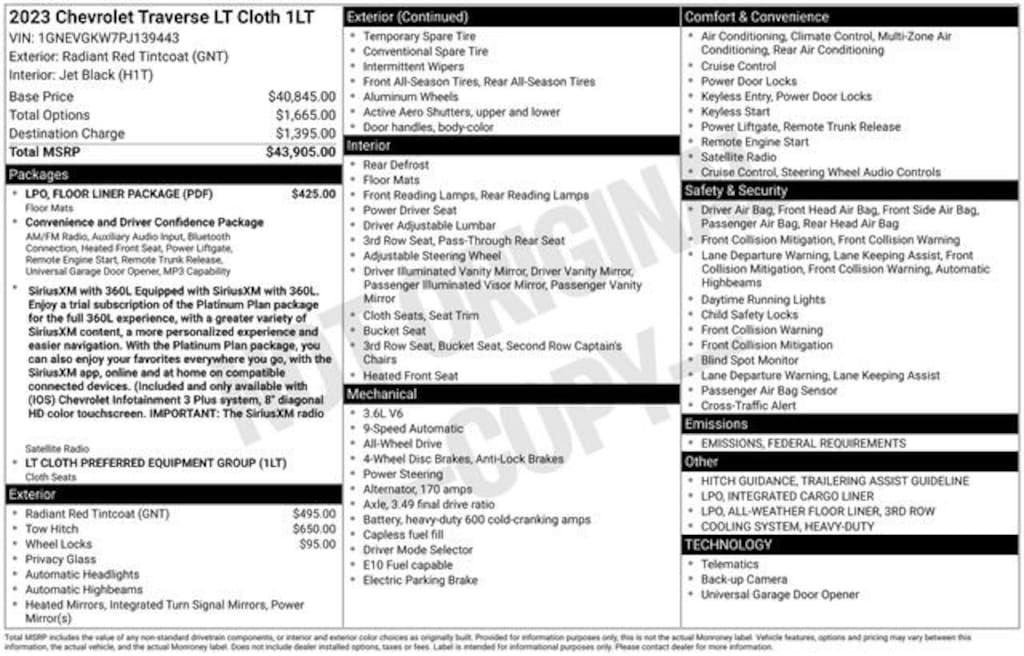 CARFAX One-Owner. Clean CARFAX. Priced below KBB Fair Purchase Price!*** WE DELIVER ***Radiant Red Tintcoat 2023 Chevrolet Traverse LT 1LT 3.6L V6 SIDI VVT 9-Speed Automatic AWD 4D Sport UtilityLocal Trade, Non Smoker, One Owner, 172 point inspection certified, 1st oil change free with purchase, 2 Key Fobs, service report available, Heated Seats, Digital Key, In-Vehicle Wi-Fi, Stolen vehicle location/ recovery system, Parking Assist, In-vehicle virtual assistant, Driver monitoring system, 1st & 2nd Row All-Weather Floor Liner (LPO), 1st & 2nd Row All-Weather Floor Mats, 2-Way Manual Front Passenger Seat Adjuster, 3.49 Axle Ratio, 3rd Row All-Weather Floor Liner (LPO), 3rd Row All-Weather Floor Mats, 3rd row seats: split-bench, 4-Wheel Disc Brakes, 6 Speakers, 6-Speaker Audio System Feature, 8-Way Power Driver Seat Adjuster, ABS brakes, Air Conditioning, All-Weather Cargo Mat (LPO), Alloy wheels, AM/FM radio: SiriusXM, Apple CarPlay/Android Auto, Auto High-beam Headlights, Automatic temperature control, Black Accent Package (LPO), Black Bowtie, Black Grille (LPO), Black Mirror Caps (LPO), Black Nameplate Kit (LPO), Black Rear License Plate Applique (LPO), Black Roof Rails, Blackout Package (LPO), Brake assist, Bright Thatcham Wheel Locks (LPO), Bumpers: body-color, Compass, Delay-off headlights, Driver door bin, Driver vanity mirror, Dual front impact airbags, Dual front side impact airbags, Electronic Stability Control, Emergency communication system, Exterior Parking Camera Rear, Floor Liner Package (LPO), Four wheel independent suspension, Front anti-roll bar, Front Bucket Seats, Front Center Armrest, Front dual zone A/C, Front reading lights, Fully automatic headlights, Garage door transmitter, Heated door mirrors, Heated Driver & Front Passenger Seats, Heated front seats, Heavy-Duty Cooling System, Hitch Guidance w/Hitch View, Illuminated entry, Integrated Cargo Liner (LPO), Interior Protection Package (LPO), Leather steering wheel, Low tire pressure warning, Midnight/Sport Edition, Occupant sensing airbag, Outside temperature display, Overhead airbag, Overhead console, Panic alarm, Passenger door bin, Passenger vanity mirror, Power door mirrors, Power Driver Lumbar Control, Power driver seat, Power Liftgate, Power steering, Power windows, Preferred Equipment Group 1LT, Premium Cloth Seat Trim, Radio data system, Radio: Chevrolet Infotainment 3 Plus System, Rear air conditioning, Rear anti-roll bar, Rear reading lights, Rear window defroster, Rear window wiper, Remote keyless entry, Security system, SiriusXM w/360L, Speed control, Speed-sensing steering, Spoiler, Steering wheel mounted audio controls, Tachometer, Telescoping steering wheel, Tilt steering wheel, Traction control, Trailering Assist Guidelines, Trailering Equipment, Trip computer, Turn signal indicator mirrors, Variably intermittent wipers, Voltmeter, Wheels: 18 Bright Silver-Painted Aluminum, Wheels: 18 Gloss Black Painted Aluminum, 1st & 2nd Row All-Weather Floor Liner (LPO), 1st & 2nd Row All-Weather Floor Mats, 2-Way Manual Front Passenger Seat Adjuster, 3.49 Axle Ratio, 3rd Row All-Weather Floor Liner (LPO), 3rd Row All-Weather Floor Mats, 3rd row seats: split-bench, 4-Wheel Disc Brakes, 6 Speakers, 6-Speaker Audio System Feature, 8-Way Power Driver Seat Adjuster, ABS brakes, Air Conditioning, All-Weather Cargo Mat (LPO), Alloy wheels, AM/FM radio: SiriusXM, Apple CarPlay/Android Auto, Auto High-beam Headlights, Automatic temperature control, Black Accent Package (LPO), Black Bowtie, Black Grille (LPO), Black Mirror Caps (LPO), Black Nameplate Kit (LPO), Black Rear License Plate Applique (LPO), Black Roof Rails, Blackout Package (LPO), Brake assist, Bright Thatcham Wheel Locks (LPO), Bumpers: body-color, Compass, Delay-off headlights, Driver door bin, Driver vanity mirror, Dual front impact airbags, Dual front side impact airbags, Electronic Stability Control, Emergency communication system, Exterior Parking Camera Rear, Floor L