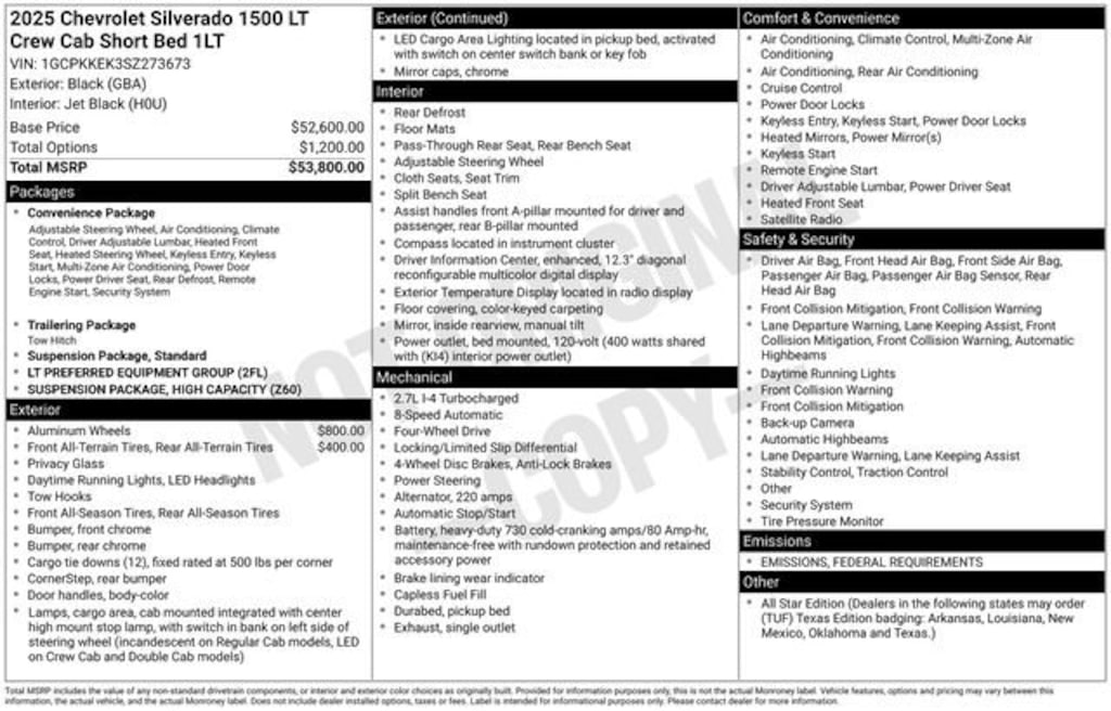 10-Way Power Driver Seat w/Lumbar, 12.3 Multicolor Reconfigurable Digital Display, 120-Volt Bed Mounted Power Outlet, 120-Volt Interior Power Outlet, 3.42 Rear Axle Ratio, 4-Wheel Disc Brakes, 6-Speaker Audio System, ABS brakes, Air Conditioning, All-Star Edition, AM/FM radio: SiriusXM with 360L, Apple CarPlay/Android Auto, Auto High-beam Headlights, Auto-Locking Rear Differential, Automatic Emergency Braking, Automatic temperature control, Bluetooth® For Phone, Brake assist, Chrome Mirror Caps, Color-Keyed Carpeting Floor Covering, Compass, Convenience Package, Deep-Tinted Glass, Dual front impact airbags, Dual front side impact airbags, Dual Rear USB Ports (Charge Only), Dual-Zone Automatic Climate Control, Electric Rear-Window Defogger, Electronic Cruise Control, Electronic Stability Control, Emergency communication system: OnStar, Following Distance Indicator, Forward Collision Alert, Front dual zone A/C, Front Frame-Mounted Black Recovery Hooks, Front Pedestrian Braking, Fully automatic headlights, HD Rear Vision Camera, Heated door mirrors, Heated Driver & Front Outboard Passenger Seats, Heated Steering Wheel, Hitch Guidance, Illuminated entry, Integrated Trailer Brake Controller, IntelliBeam Automatic High Beam On/Off, Keyless Open & Start, Lane Keep Assist w/Lane Departure Warning, LED Cargo Area Lighting, Low tire pressure warning, Manual Tilt/Telescoping Steering Column, Occupant sensing airbag, OnStar Services Capable, Outside temperature display, Overhead airbag, Power door mirrors, Power driver seat, Power Front Windows w/Driver Express Up/Down, Power Front Windows w/Passenger Express Down, Power Rear Windows w/Express Down, Preferred Equipment Group 2FL, Premium audio system: Chevrolet Infotainment 3 Premium, Radio data system, Radio: Chevrolet Infotainment 3 Premium System, Rear 60/40 Folding Bench Seat (Folds Up), Remote keyless entry, Remote Vehicle Starter System, SiriusXM w/360L Trial Subscription, Split folding rear seat, Steering Wheel Audio Controls, Steering wheel mounted audio controls, Teen Driver, Telescoping steering wheel, Theft Deterrent System (Unauthorized Entry), Tilt steering wheel, Tire Pressure Monitoring System, Traction control, Trailering Package, Variably intermittent wipers, Wheels: 20 x 9 Painted Aluminum, Wi-Fi Hot Spot Capable, Wrapped Steering Wheel, 40/20/40 Front Split-Bench Seat, 6 Speakers, Alloy wheels, Bumpers: chrome, Cloth Seat Trim, Delay-off headlights, Driver door bin, Driver vanity mirror, Front anti-roll bar, Front Center Armrest w/Storage, Front reading lights, Front wheel independent suspension, Heated front seats, Heated steering wheel, High Capacity Suspension Package, Overhead console, Panic alarm, Passenger door bin, Passenger vanity mirror, Power steering, Power windows, Rear reading lights, Rear step bumper, Rear window defroster, Security system, Speed control, Speed-sensing steering, Standard Suspension Package, Tachometer, Trip computer, Voltmeter, 10-Way Power Driver Seat w/Lumbar, 12.3 Multicolor Reconfigurable Digital Display, 120-Volt Bed Mounted Power Outlet, 120-Volt Interior Power Outlet, 3.42 Rear Axle Ratio, 4-Wheel Disc Brakes, 6-Speaker Audio System, ABS brakes, Air Conditioning, All-Star Edition, AM/FM radio: SiriusXM with 360L, Apple CarPlay/Android Auto, Auto High-beam Headlights, Auto-Locking Rear Differential, Automatic Emergency Braking, Automatic temperature control, Bluetooth® For Phone, Brake assist, Chrome Mirror Caps, Color-Keyed Carpeting Floor Covering, Compass, Convenience Package, Deep-Tinted Glass, Dual front impact airbags, Dual front side impact airbags, Dual Rear USB Ports (Charge Only), Dual-Zone Automatic Climate Control, Electric Rear-Window Defogger, Electronic Cruise Control, Ele