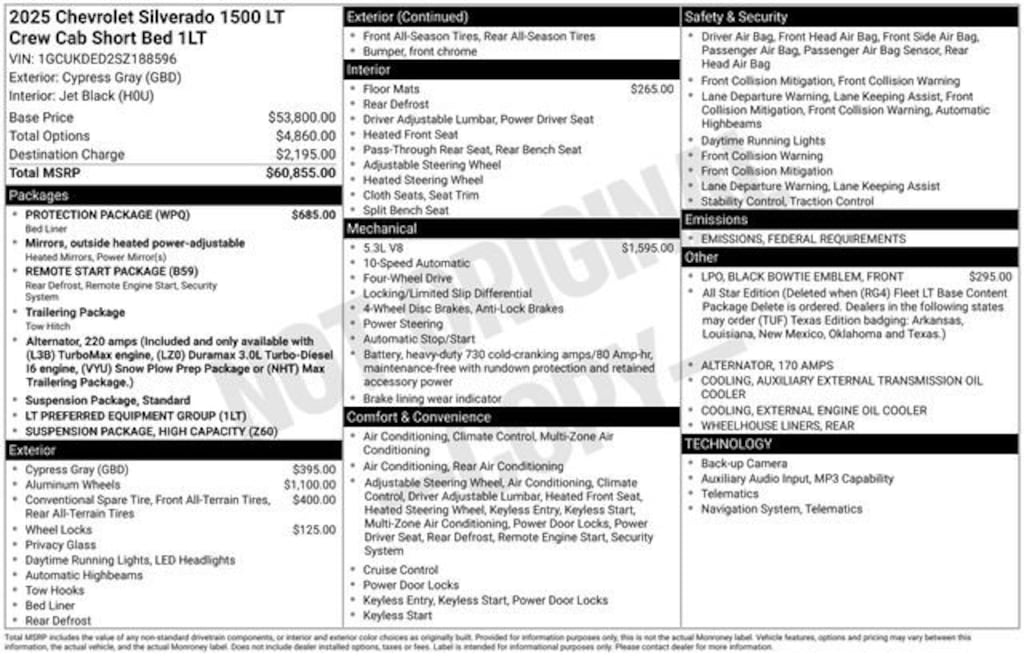 10-Way Power Driver Seat w/Lumbar, 12.3 Multicolor Reconfigurable Digital Display, 120-Volt Bed Mounted Power Outlet, 120-Volt Interior Power Outlet, 3.23 Rear Axle Ratio, 4-Wheel Disc Brakes, 6-Speaker Audio System, ABS brakes, Air Conditioning, All-Star Edition, All-Weather Floor Liner (LPO), AM/FM radio: SiriusXM with 360L, Apple CarPlay/Android Auto, Auto High-beam Headlights, Auto-Locking Rear Differential, Automatic Emergency Braking, Automatic temperature control, Bluetooth® For Phone, Brake assist, Chevytec Spray-On Black Bedliner, Chrome Mirror Caps, Color-Keyed Carpeting Floor Covering, Compass, Convenience Package, Deep-Tinted Glass, Dual front impact airbags, Dual front side impact airbags, Dual Rear USB Ports (Charge Only), Dual-Zone Automatic Climate Control, Electric Rear-Window Defogger, Electronic Cruise Control, Electronic Stability Control, EZ Lift Power Lock & Release Tailgate, Following Distance Indicator, Forward Collision Alert, Front Black Bowtie Emblem (LPO), Front dual zone A/C, Front Frame-Mounted Black Recovery Hooks, Front Pedestrian Braking, Front Rubberized Vinyl Floor Mats, Fully automatic headlights, HD Rear Vision Camera, Heated Driver & Front Outboard Passenger Seats, Heated Power-Adjustable Outside Mirrors, Heated Steering Wheel, Hitch Guidance, Illuminated entry, Inside Rear-View Mirror w/Tilt, Integrated Trailer Brake Controller, IntelliBeam Automatic High Beam On/Off, Keyless Open & Start, Lane Keep Assist w/Lane Departure Warning, LED Cargo Area Lighting, Low tire pressure warning, Manual Tilt/Telescoping Steering Column, Occupant sensing airbag, OnStar Services Capable, Outside temperature display, Overhead airbag, Power driver seat, Power Front Windows w/Driver Express Up/Down, Power Front Windows w/Passenger Express Down, Power Rear Windows w/Express Down, Preferred Equipment Group 1LT, Premium audio system: Chevrolet Infotainment 3 Premium, Protection Package, Radio data system, Radio: Chevrolet Infotainment 3 Premium System, Rear 60/40 Folding Bench Seat (Folds Up), Rear Rubberized-Vinyl Floor Mats, Rear Wheelhouse Liners, Remote keyless entry, Remote Start Package, Remote Vehicle Starter System, SiriusXM w/360L Trial Subscription, Standard Tailgate, Steering Wheel Audio Controls, Steering wheel mounted audio controls, Teen Driver, Telescoping steering wheel, Theft Deterrent System (Unauthorized Entry), Tilt steering wheel, Tire Pressure Monitoring System, Traction control, Trailering Package, Variably intermittent wipers, Wheel Locks (Set of 4) (LPO), Wheels: 20 x 9 Painted Aluminum, Wi-Fi Hot Spot Capable, Wrapped Steering Wheel, 170 Amp Alternator, 220 Amp Alternator, 40/20/40 Front Split-Bench Seat, 6 Speakers, Alloy wheels, Auxiliary External Transmission Oil Cooler, Bumpers: chrome, Cloth Seat Trim, Delay-off headlights, Driver door bin, Driver vanity mirror, Emergency communication system: OnStar, External Engine Oil Cooler, Front anti-roll bar, Front Center Armrest w/Storage, Front reading lights, Front wheel independent suspension, Heated door mirrors, Heated front seats, Heated steering wheel, High Capacity Suspension Package, Overhead console, Panic alarm, Passenger door bin, Passenger vanity mirror, Power door mirrors, Power steering, Power windows, Rear reading lights, Rear step bumper, Rear window defroster, Security system, Speed control, Speed-sensing steering, Split folding rear seat, Standard Suspension Package, Tachometer, Trip computer, Voltmeter, 10-Way Power Driver Seat w/Lumbar, 12.3 Multicolor Reconfigurable Digital Display, 120-Volt Bed Mounted Power Outlet, 120-Volt Interior Power Outlet, 3.23 Rear Axle Ratio, 4-Wheel Disc Brakes, 6-Speaker Audio System, ABS brakes, Air Conditioning, All-Star Edition, All-Weather Floor Liner (LPO),