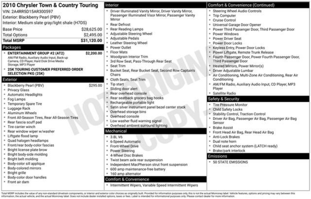Recent Arrival!*** WE DELIVER ***Blackberry Pearlcoat 2010 Chrysler Town & Country Touring 4D Passenger Van 3.8L V6 OHV 6-Speed Automatic FWD16 x 6.5 Aluminum Wheels, 2nd Row Buckets w/Fold-In-Floor, 2nd Row Overhead 9 Video Screen, 3.246 Axle Ratio, 3rd Row Overhead 9 Video Screen, 3rd row seats: split-bench, 4-Wheel Disc Brakes, 6 Speakers, ABS brakes, Adjustable pedals, Air Conditioning, Alloy wheels, AM/FM radio: SIRIUS, Anti-whiplash front head restraints, Audio Jack Input for Mobile Devices, Bodyside moldings, Brake assist, Bumpers: body-color, CD player, Cloth Low-Back Bucket Seats, Compass, Delay-off headlights, Driver door bin, Driver vanity mirror, Driver's Seat Mounted Armrest, Dual front impact airbags, Electronic Stability Control, Entertainment Group #2, Front anti-roll bar, Front Bucket Seats, Front dual zone A/C, Front fog lights, Front reading lights, Front wheel independent suspension, Fully automatic headlights, Garage door transmitter, Heated door mirrors, Illuminated entry, Leather Shift Knob, Leather Trimmed Bucket Seats, Low tire pressure warning, Normal Duty Suspension, Outside temperature display, Overhead airbag, Overhead console, Panic alarm, ParkView Rear Back-Up Camera, Passenger door bin, Passenger seat mounted armrest, Passenger vanity mirror, Power door mirrors, Power driver seat, Power Liftgate, Power steering, Power windows, Quick Order Package 25K, Radio data system, Radio: Media Center 130 CD/MP3, Radio: Media Center 430 CD/DVD/MP3/HDD, Rear air conditioning, Rear anti-roll bar, Rear reading lights, Rear window defroster, Rear window wiper, Reclining 3rd row seat, Remote keyless entry, Roof rack, Single-Disc DVD Player, Speed control, Split folding rear seat, Spoiler, Steering wheel mounted audio controls, Tachometer, Tilt steering wheel, Traction control, Trip computer, Variably intermittent wipers, Video Remote Control, Wireless Headphones.