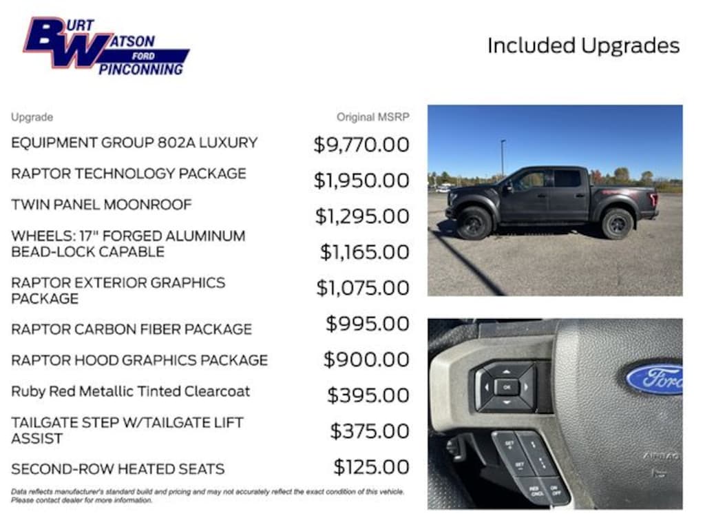 Local Trade, Non Smoker, Leather Seats, 172 point inspection certified, 1st oil change free with purchase, Ceramic coating available on all purchases at discounted pricing, service report available, Cooling Seats, Heated Seats, 10-Way Power Driver & Passenger Seats, 17" Cast Aluminum Wheels, 17" Forged Aluminum Bead-Lock Capable Wheels, 360 Degree Camera, 4-Wheel Disc Brakes, 4.10 Front Axle w/Torsen Differential, 7 Speakers, 8-Way Power Driver's Seat w/Power Lumbar, 8" Productivity Screen, ABS brakes, Adaptive Cruise Control w/Collision Mitigation, Advanced Security Pack, Air Conditioning, Alloy wheels, AM/FM radio: SiriusXM, Ambient Lighting - Ice Blue Color Only, Auto High Beam, Auto-dimming Rear-View mirror, BLIS Blind Spot Information System, Brake assist, CD player, Compass, Delay-off headlights, Driver door bin, Driver vanity mirror, Dual front impact airbags, Dual front side impact airbags, Dual-Zone Electronic Automatic Temperature Control, Electronic Locking w/4.10 Axle Ratio, Electronic Stability Control, Emergency communication system: 911 Assist, Equipment Group 802A Luxury, Exterior Parking Camera Rear, Front anti-roll bar, Front Bucket Seats, Front Center Armrest, Front fog lights, Front reading lights, Front wheel independent suspension, Fully automatic headlights, GVWR: 7,050 lbs Payload Package, Heated Leather 40/Console/40 Front Seats, Heated Steering Wheel, Illuminated entry, Inflatable Rear Safety Belts, Integrated Trailer Brake Controller, Intelligent Access w/Push-Button Start, Lane-Keeping System, Leather steering wheel, LED Box Lighting, LED Sideview Mirror Spotlights, Low tire pressure warning, Memory System (Seat, Pedal, Exterior Mirror), Navigation System, Occupant sensing airbag, Outside temperature display, Overhead airbag, Overhead console, Panic alarm, Passenger door bin, Passenger vanity mirror, Power door mirrors, Power driver seat, Power Glass Heated Sideview Mirrors, Power steering, Power Tilt/Telescoping Steering Column w/Memory, Power windows, Power-Adjustable Pedals, Power-Sliding Rear Window, Pro Trailer Backup Assist, Radio data system, Radio: B&O Play Premium Audio System, Raptor Carbon Fiber Package, Raptor Exterior Graphics Package, Raptor Hood Graphics Package, Raptor Technology Package, Rear Parking Sensors, Rear reading lights, Rear step bumper, Rear window defroster, Remote keyless entry, Remote Start System w/Remote Tailgate Release, Security system, Speed control, Speed-sensing steering, Split folding rear seat, Steering wheel mounted audio controls, SYNC, SYNC 3, SYNC Connect, Tachometer, Tailgate Applique FORD, Tailgate Step w/Tailgate Lift Assist, Telescoping steering wheel, Tilt steering wheel, Traction control, Trip computer, Twin Panel Moonroof, Unique Carbon Fiber Shift Knob, Unique Cloth Trim Seats, Universal Garage Door Opener, Variably intermittent wipers, Voice-Activated Touchscreen Navigation System.