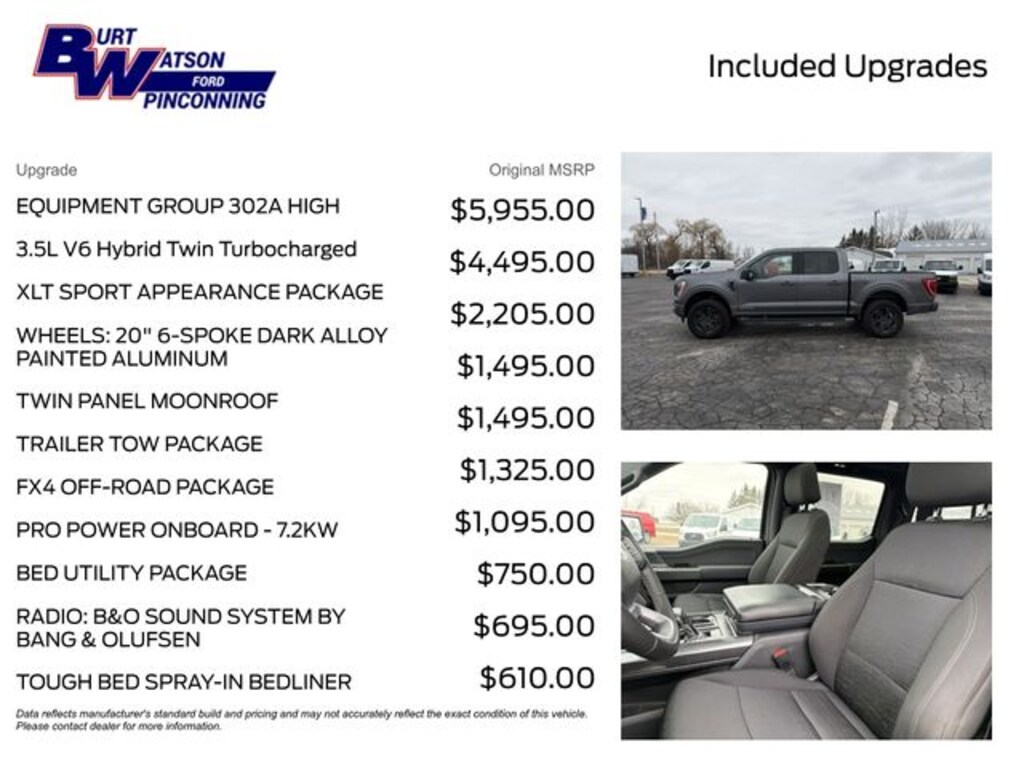 Local Trade, Non Smoker, 110 point inspection certified, 172 point inspection certified, 1st oil change free with purchase, Ceramic coating available on all purchases at discounted pricing, service report available, Heated Seats, 10-Way Power Driver & Passenger Seats, 2-Bar Style Grille w/Chrome 2 Minor Bars, 4-Wheel Disc Brakes, 6 Speakers, 8" Productivity Screen in Instrument Cluster, ABS brakes, Accent-Color Step Bars, Air Conditioning, Alloy wheels, AM/FM radio, Auto High-beam Headlights, Auto Start-Stop Removal (DISC), Auto-Dimming Rear-View Mirror, Bed Utility Package, Black 2-Bar Style Grille w/Black Surround/Accents, Body-Color Door & Tailgate Handles, Body-Color Front & Rear Bumpers, Box Side Decals, BoxLink, Brake assist, Bright Polished Step Bars, Bumpers: chrome, Chrome Door & Tailgate Handles w/Body-Color Bezel, Chrome Single-Tip Exhaust, Class IV Trailer Hitch Receiver, Cloth 40/20/40 Front Seat, Compass, Delay-off headlights, Driver door bin, Driver vanity mirror, Dual front impact airbags, Dual front side impact airbags, Dual Zone Electronic Automatic Temperature Control, Electronic Locking w/3.73 Axle Ratio, Electronic Stability Control, Emergency communication system: SYNC 4 911 Assist, Equipment Group 302A High, Exterior Parking Camera Rear, Front anti-roll bar, Front Center Armrest w/Storage, Front fog lights, Front reading lights, Front wheel independent suspension, Fully automatic headlights, FX4 Off-Road Package, GVWR: 7,350 lbs Payload Package, Heated door mirrors, Heated Front Seats, Illuminated entry, Integrated Trailer Brake Controller, Intelligent Access w/Push Button Start, Interior Work Surface, LED Box Lighting, LED Reflector Headlamps, LED Sideview Mirror Spotlights, Low tire pressure warning, Occupant sensing airbag, Onboard 400W Outlet, Outside temperature display, Overhead airbag, Overhead console, Panic alarm, Passenger door bin, Passenger vanity mirror, Power door mirrors, Power Glass Heated Sideview Mirrors, Power steering, Power windows, Power-Sliding Rear Window, Pro Power Onboard - 7.2KW, Pro Trailer Backup Assist & Pro Trailer Hitch Assist, Radio data system, Radio: AM/FM SiriusXM w/360L, Radio: AM/FM Stereo w/6 Speakers, Radio: B&O Sound System by Bang & Olufsen, Rear reading lights, Rear step bumper, Rear Under-Seat Storage, Rear window defroster, Remote keyless entry, Remote Start System, SecuriCode Drivers Side Keyless-Entry Keypad, Security system, Speed control, Speed-sensing steering, Split folding rear seat, Steering wheel mounted audio controls, SYNC 4, SYNC 4 w/Enhanced Voice Recognition, Tachometer, Tailgate Step w/Tailgate Work Surface, Telescoping steering wheel, Tilt steering wheel, Tough Bed Spray-In Bedliner, Traction control, Trailer Tow Package, Tray Style Floor Liner (47W), Trip computer, Twin Panel Moonroof, Unique Sport Cloth 40/Console/40 Front-Seats, Variably intermittent wipers, Voltmeter, Wheels: 17" Silver Painted Aluminum, Wheels: 18" 6-Spoke Machined Aluminum, Wheels: 18" Chrome-Like PVD, Wheels: 20" 6-Spoke Dark Alloy Painted Aluminum, Wrapped Steering Wheel, XLT Chrome Appearance Package, XLT Sport Appearance Package, Zone Lighting.