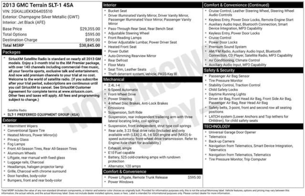 Recent Arrival! Clean CARFAX. Odometer is 40395 miles below market average!*** WE DELIVER ***Champagne Silver Metallic 2013 GMC Terrain SLT-1 4D Sport Utility 2.4L 4-Cylinder SIDI DOHC VVT 6-Speed Automatic FWD**APPLE CAR PLAY**, **Bluetooth, Hands-Free**, **Rear Backup Camera**, 1st oil change free with purchase, 2 Key Fobs, All weather floor matts, Heated Seats, In-Vehicle Wi-Fi, Remote control start, Stolen vehicle location/ Recovery system, Driver monitoring system, Vehicle Usage Alerts, In-vehicle virtual assistant, Vehicle usage alerts, 17 x 7.5 Painted Aluminum Wheels, 3.23 Axle Ratio, Alloy wheels, Front Bucket Seats, Heated Driver & Front Passenger Seats, Heated front seats, Preferred Equipment Group 4SA, Remote Vehicle Start, Single-Zone Automatic Climate Control, Universal Home Remote, 4-Wheel Disc Brakes, 8 Speakers, ABS brakes, Air Conditioning, AM/FM radio: SiriusXM, Auto-dimming Rear-View mirror, Automatic temperature control, Brake assist, Bumpers: body-color, CD player, Compass, Delay-off headlights, Driver door bin, Driver vanity mirror, Dual front impact airbags, Dual front side impact airbags, E10 Fuel Capable, Electronic Stability Control, Emergency communication system: OnStar Directions & Connections, Exterior Parking Camera Rear, Four wheel independent suspension, Front anti-roll bar, Front Center Armrest, Front fog lights, Front reading lights, Fully automatic headlights, Heated door mirrors, Illuminated entry, IntelliLink, Low tire pressure warning, Occupant sensing airbag, Outside temperature display, Overhead airbag, Panic alarm, Passenger door bin, Passenger vanity mirror, Perforated Leather-Appointed Seat Trim, Power door mirrors, Power driver seat, Power Programmable Rear Liftgate, Power steering, Power windows, Radio data system, Radio: Color Touch AM/FM Stereo w/CD Player, Rear anti-roll bar, Rear seat center armrest, Rear window defroster, Rear window wiper, Remote keyless entry, Roof rack: rails only, Security system, SIRIUSXM Satellite Radio, Speed control, Speed-sensing steering, Split folding rear seat, Spoiler, Steering wheel mounted audio controls, Tachometer, Telescoping steering wheel, Tilt steering wheel, Traction control, Trip computer, Variably intermittent wipers, 17 x 7.5 Painted Aluminum Wheels, 3.23 Axle Ratio, Alloy wheels, Front Bucket Seats, Heated Driver & Front Passenger Seats, Heated front seats, Preferred Equipment Group 4SA, Remote Vehicle Start, Single-Zone Automatic Climate Control, Universal Home Remote.