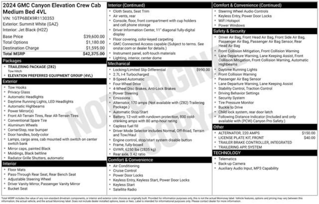 CARFAX One-Owner. Odometer is 7299 miles below market average! Priced below KBB Fair Purchase Price!*** WE DELIVER ***Summit White 2024 GMC Canyon Elevation 4D Crew Cab 2.7L I4 Turbocharged DOHC 16V LEV3-SULEV30 310hp 8-Speed Automatic 4WD**APPLE CAR PLAY**, **Rear Backup Camera**, **Heated Seats**, 172 point inspection certified, 1st oil change free with purchase, 2 Key Fobs, All weather floor matts, Heated Seats, In-Vehicle Wi-Fi, Remote control start, Stolen vehicle location/ Recovery system, Driver monitoring system, Vehicle Usage Alerts, In-vehicle virtual assistant, Vehicle usage alerts, 220 Amps Alternator, 3.42 Rear Axle Ratio, Apple CarPlay/Android Auto, Automatic Emergency Braking, Automatic Locking Rear Differential, Canyon Pro Safety, Following Distance Indicator, Forward Collision Alert, Front Bucket Seats, Front Pedestrian & Bicyclist Braking, Integrated Trailer Brake Controller, IntelliBeam Automatic High Beam On/Off, Lane Keep Assist w/Lane Departure Warning, Preferred Equipment Group 4VL, ProGrade Trailering System, Remote Start Kit w/2 Key Fobs (LPO), Remote Vehicle Starter System, Trailering App System, Trailering Package, Wheels: 18 x 8.5 Dark Gray Painted Aluminum, 1 Rear USB Ports in Center Console (Charge-Only), 2 1st Row USB Charge/Data Ports, 4-Way Manual Front Passenger Seat Adjuster, 4-Wheel Disc Brakes, 6 Speakers, 6-Speaker Audio System Feature, 6-Way Manual Driver Seat Adjuster, ABS brakes, Air Conditioning, Alloy wheels, AM/FM radio, Auto High-beam Headlights, Automatic Stop/Start, Brake assist, Bumpers: body-color, Cloth Seat Trim, Compass, Delay-off headlights, Driver door bin, Driver Mode Selector, Driver vanity mirror, Dual front impact airbags, Dual front side impact airbags, Electronic Stability Control, Front anti-roll bar, Front Center Armrest, Front License Plate Kit, Front Passenger Seatback Map Pocket, Front wheel independent suspension, Illuminated entry, Low tire pressure warning, Navigation System, Occupant sensing airbag, Outside temperature display, Overhead airbag, Overhead console, Panic alarm, Passenger door bin, Passenger vanity mirror, Power door mirrors, Power steering, Power windows, Radio data system, Radio: 11.3 Diagonal Premium GMC Infotainment Sys, Rear reading lights, Rear step bumper, Remote keyless entry, Security system, SiriusXM w/360L, Speed control, Speed-sensing steering, Split folding rear seat, Steering wheel mounted audio controls, Stop/Start System Disable Button Engine Control, Tachometer, Tilt steering wheel, Traction control, Trip computer, Variably intermittent wipers, Wireless Apple CarPlay/Wireless Android Auto, 220 Amps Alternator, 3.42 Rear Axle Ratio, Apple CarPlay/Android Auto, Automatic Emergency Braking, Automatic Locking Rear Differential, Canyon Pro Safety, Following Distance Indicator, Forward Collision Alert, Front Bucket Seats, Front Pedestrian & Bicyclist Braking, Integrated Trailer Brake Controller, IntelliBeam Automatic High Beam On/Off, Lane Keep Assist w/Lane Departure Warning, Preferred Equipment Group 4VL, ProGrade Trailering System, Remote Start Kit w/2 Key Fobs (LPO), Remote Vehicle Starter System, Trailering App System, Trailering Package, Wheels: 18 x 8.5 Dark Gray Painted Aluminum.