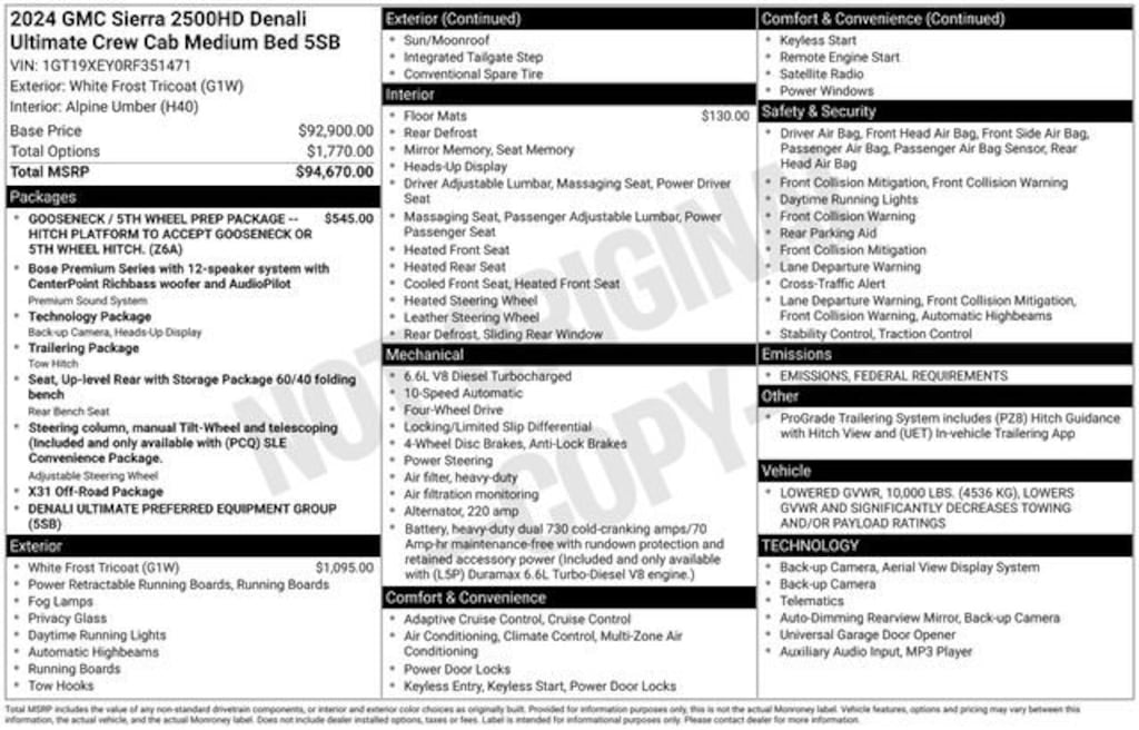 12 Speakers, 120-Volt Bed Mounted Power Outlet, 120-Volt Instrument Panel Power Outlet, 16-Way Power Driver Seat Adjuster w/Lumbar, 16-Way Power Passenger Seat Adjuster w/Lumbar, 2 Charge-Only Rear USB Ports, 2 Charge/Data USB Ports Inside Center Console, 2 USB Ports, 2-Speed Active Transfer Case, 220-Amp Alternator, 3.42 Axle Ratio, 4-Wheel Disc Brakes, ABS brakes, Air Conditioning, Alloy wheels, AM/FM radio: SiriusXM with 360L, Apple CarPlay/Android Auto, Auto High-beam Headlights, Auto-dimming door mirrors, Auto-dimming Rear-View mirror, Automatic Emergency Braking, Automatic temperature control, Bed View Camera w/2 Trailer Camera Provisions, Block heater, Bose Premium Series 12-Speaker System, Brake assist, Buckle to Drive, Bumpers: body-color, Compass, Deep-Tinted Glass, Delay-off headlights, Driver door bin, Driver Memory, Driver vanity mirror, Dual front impact airbags, Dual front side impact airbags, Dual Heavy-Duty 70 Amp Battery, Electric Rear-Window Defogger, Electronic Stability Control, Emergency communication system: OnStar and GMC connected services capable, Floor-Mounted Center Console, Following Distance Indicator, Forward Collision Alert, Front anti-roll bar, Front Bucket Seats, Front Center Armrest, Front dual zone A/C, Front fog lights, Front Pedestrian Braking, Front Prem Floor Liners w/Removable Carpet Insert, Front Rain-Sensing Wipers, Front reading lights, Front wheel independent suspension, Full Grain Leather Seat Trim, Fully automatic headlights, Garage door transmitter, Genuine wood dashboard insert, Genuine wood door panel insert, GMC Connected Access Capable, Gooseneck/5th Wheel Prep Package, HD Surround Vision, Heads-Up Display, Heated 2nd Row Outboard Seats, Heated door mirrors, Heated Driver & Front Outboard Passenger Seats, Heated front seats, Heated rear seats, Heated steering wheel, Hill Descent Control, Hitch Guidance w/Hitch View, Illuminated entry, In-Vehicle Trailering System App, Inside Rearview Auto-Dimming Rear Camera Mirror, Integrated Trailer Brake Controller, IntelliBeam Automatic High Beam On/Off, Keyless Open & Start, Lane Departure Warning System, Leather steering wheel, LED Cargo Area Lighting, LED Smoked Amber Roof Marker Lamps, Low tire pressure warning, Manual Tilt-Wheel/Telescoping Steering Column, Memory seat, Multicolor 15 Diagonal Head-Up Display, Occupant sensing airbag, Off-Road Suspension, OnStar & GMC Connected Services Capable, Outside temperature display, Overhead airbag, Overhead console, Panic alarm, Passenger door bin, Passenger vanity mirror, Pickup Box, Power door mirrors, Power driver seat, Power Front Passenger Windows w/Express Up/Down, Power moonroof, Power passenger seat, Power Sliding Rear Window w/Defogger, Power steering, Power Sunroof, Power windows, Preferred Equipment Group 5SB, Premium audio system: Premium GMC Infotainment System, Push Button Start, Radio: AM/FM w/Premium GMC Infotainment System, Rain sensing wipers, Rear Cross Traffic Alert, Rear Prem Floor Liners w/Removable Carpet Insert, Rear reading lights, Rear seat center armrest, Rear step bumper, Rear Wheelhouse Liners, Rear window defroster, Remote keyless entry, Remote Vehicle Starter System, Safety Alert Seat, Security system, Signature Denali Grille in Vadar Chrome, SiriusXM w/360L, Speed control, Speed-sensing steering, Split folding rear seat, Spray-On Bedliner w/Denali Logo, Steering Wheel Audio Controls, Steering wheel mounted audio controls, Tachometer, Technology Package, Telescoping steering wheel, Tilt steering wheel, Traction control, Trailer Cam Provisions & Trailer Viewing Software, Trailer Side Blind Zone Alert, Trailer Tire Pressure Monitor Sensors, Trip computer, Turn signal indicator mirrors, Ultrasonic Front &