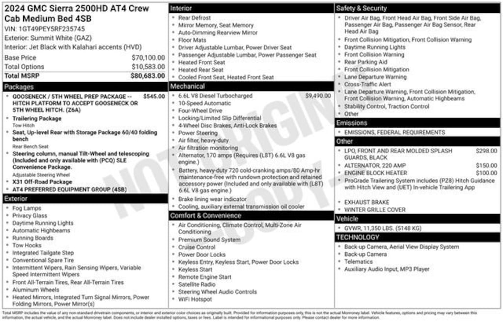 10-Way Power Driver Seat Adjuster w/Lumbar, 10-Way Power Passenger Seat Adjuster w/Lumbar, 120-Volt Bed Mounted Power Outlet, 120-Volt Instrument Panel Power Outlet, 2 Charge-Only Rear USB Ports, 2 Charge/Data USB Ports Inside Center Console, 2 USB Ports, 2-Speed Active Transfer Case, 220-Amp Alternator, 4-Wheel Disc Brakes, 7 Speakers, ABS brakes, Air Conditioning, Alloy wheels, AM/FM radio: SiriusXM with 360L, Apple CarPlay/Android Auto, Auto High-beam Headlights, Auto-dimming door mirrors, Auto-dimming Rear-View mirror, Automatic Emergency Braking, Automatic temperature control, Bed View Camera w/2 Trailer Camera Provisions, Black Front & Rear Molded Splash Guards (LPO), Bose Premium 7-Speaker Sound System, Brake assist, Buckle to Drive, Bumpers: body-color, Compass, Deep-Tinted Glass, Delay-off headlights, Driver door bin, Driver Memory, Driver vanity mirror, Dual front impact airbags, Dual front side impact airbags, Electric Rear-Window Defogger, Electronic Stability Control, Engine Block Heater, Exhaust Brake, Floor-Mounted Center Console, Following Distance Indicator, Forward Collision Alert, Front anti-roll bar, Front Bucket Seats, Front Center Armrest, Front dual zone A/C, Front fog lights, Front Pedestrian Braking, Front Prem Floor Liners w/Removable Carpet Insert, Front Rain-Sensing Wipers, Front reading lights, Front wheel independent suspension, Fully automatic headlights, Gloss Black Header Grille & Grille Insert Bars, GMC Connected Access Capable, Gooseneck/5th Wheel Prep Package, HD Surround Vision, Heated 2nd Row Outboard Seats, Heated door mirrors, Heated Driver & Front Outboard Passenger Seats, Heated front seats, Heated rear seats, Heated steering wheel, Heavy-Duty 80 Amp Battery, Hill Descent Control, Hitch Guidance w/Hitch View, Illuminated entry, In-Vehicle Trailering System App, Integrated Trailer Brake Controller, IntelliBeam Automatic High Beam On/Off, Keyless Open & Start, Lane Departure Warning System, LED Cargo Area Lighting, Low tire pressure warning, Manual Tilt-Wheel/Telescoping Steering Column, Memory seat, Occupant sensing airbag, Off-Road Suspension, OnStar & GMC Connected Services Capable, Outside temperature display, Overhead airbag, Overhead console, Panic alarm, Passenger door bin, Passenger vanity mirror, Perforated Leather-Appointed Front Seat Trim, Pickup Box, Power door mirrors, Power driver seat, Power Front Passenger Windows w/Express Up/Down, Power passenger seat, Power steering, Power windows, Preferred Equipment Group 4SB, Premium audio system: Premium GMC Infotainment System, Push Button Start, Radio: AM/FM w/Premium GMC Infotainment System, Rain sensing wipers, Rear Cross Traffic Alert, Rear Prem Floor Liners w/Removable Carpet Insert, Rear reading lights, Rear seat center armrest, Rear step bumper, Rear Wheelhouse Liners, Rear window defroster, Remote keyless entry, Remote Vehicle Starter System, Safety Alert Seat, Security system, SiriusXM w/360L, Speed control, Speed-sensing steering, Split folding rear seat, Spray-On Bedliner w/AT4 Logo, Steering Wheel Audio Controls, Steering wheel mounted audio controls, Tachometer, Telescoping steering wheel, Tilt steering wheel, Traction control, Trailer Cam Provisions & Trailer Viewing Software, Trailer Side Blind Zone Alert, Trip computer, Turn signal indicator mirrors, Ultrasonic Front & Rear Park Assist, Unauthorized Entry Theft-Deterrent System, Variably intermittent wipers, Ventilated Driver & Front Passenger Seats, Ventilated front seats, Voltmeter, Wheels: 20 High Gloss Black 8 Spokes Aluminum, Winter Grille Cover, Wireless Charging, Wireless Phone Projection, X31 Off-Road Package.