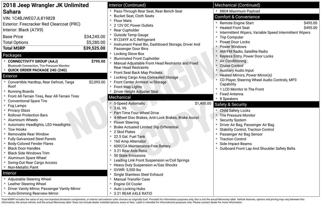 125 point inspection, Wrangler JK Unlimited Sahara, 4D Sport Utility, 3.6L V6 24V VVT, 5-Speed Automatic, 4WD, 18" x 7.5" Polished Satin Carbon Wheels, 4-Wheel Disc Brakes, 8 Speakers, ABS brakes, Air Conditioning, AM/FM radio: SiriusXM, Audio Jack Input for Mobile Devices, Auto-dimming Rear-View mirror, Body Color Appliques Front Bumper, Body Color Appliques Rear Bumper, Body Color/Accent Color Grille, Brake assist, CD player, Cloth Seats w/Adjustable Head Restraints, Connectivity Group, Driver Height Adjuster Seat, Driver vanity mirror, Dual front impact airbags, Electronic Stability Control, Front Bucket Seats, Front Center Armrest w/Storage, Front fog lights, Front reading lights, Front Seat Back Map Pockets, Fully automatic headlights, Heated door mirrors, Heated Front Seats, Heavy Duty Suspension w/Gas Shocks, Illuminated entry, Integrated roll-over protection, Leather steering wheel, Low tire pressure warning, Occupant sensing airbag, Outside temperature display, Panic alarm, Passenger door bin, Passenger vanity mirror, Power door mirrors, Power steering, Power windows, Quick Order Package 24G, R1234YF A/C Refrigerant, Radio data system, Radio: 130, Rear anti-roll bar, Remote keyless entry, Remote Start System, Security system, Speed control, Split folding rear seat, Steering wheel mounted audio controls, Tachometer, Tilt steering wheel, Tire Pressure Monitoring Display, Traction control, Uconnect Voice Command w/Bluetooth, Variably intermittent wipers, Vehicle Information Center, 3.21 Rear Axle Ratio, Alloy wheels, Compass, Driver door bin, Front anti-roll bar, Trip computer, Wrangler JK Unlimited Sahara, 4D Sport Utility, 3.6L V6 24V VVT, 5-Speed Automatic, 4WD, 18" x 7.5" Polished Satin Carbon Wheels, 4-Wheel Disc Brakes, 8 Speakers, ABS brakes, Air Conditioning, AM/FM radio: SiriusXM, Audio Jack Input for Mobile Devices, Auto-dimming Rear-View mirror, Body Color Appliques Front Bumper, Body Color Appliques Rear Bumper, Body Color/Accent Color Grille, Brake assist, CD player, Cloth Seats w/Adjustable Head Restraints, Connectivity Group, Driver Height Adjuster Seat, Driver vanity mirror, Dual front impact airbags, Electronic Stability Control, Front Bucket Seats, Front Center Armrest w/Storage, Front fog lights, Front reading lights, Front Seat Back Map Pockets, Fully automatic headlights, Heated door mirrors, Heated Front Seats, Heavy Duty Suspension w/Gas Shocks, Illuminated entry, Integrated roll-over protection, Leather steering wheel, Low tire pressure warning, Occupant sensing airbag, Outside temperature display, Panic alarm, Passenger door bin, Passenger vanity mirror, Power door mirrors, Power steering, Power windows, Quick Order Package 24G, R1234YF A/C Refrigerant, Radio data system, Radio: 130, Rear anti-roll bar, Remote keyless entry, Remote Start System, Security system, Speed control, Split folding rear seat, Steering wheel mounted audio controls, Tachometer, Tilt steering wheel, Tire Pressure Monitoring Display, Traction control, Uconnect Voice Command w/Bluetooth, Variably intermittent wipers, Vehicle Information Center.