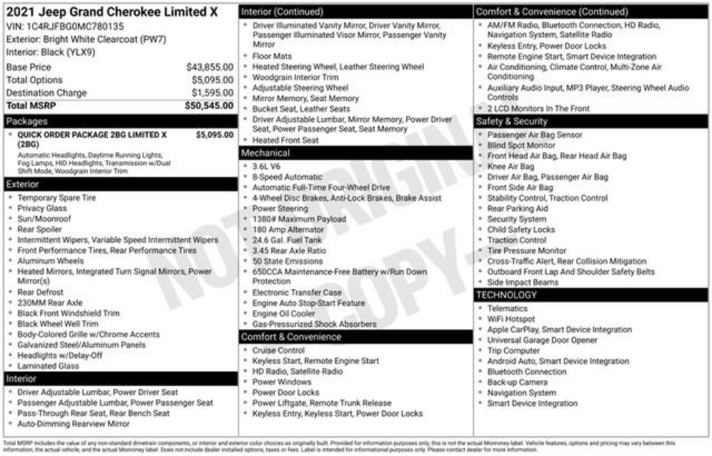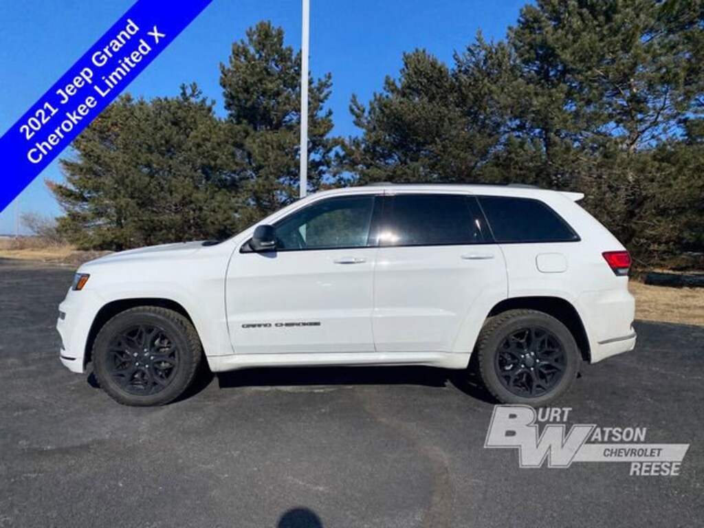 Recent Arrival! Clean CARFAX. Odometer is 8251 miles below market average!*** WE DELIVER ***Bright White Clearcoat 2021 Jeep Grand Cherokee Limited X 3.6L V6 24V VVT 8-Speed Automatic 4WD 4D Sport UtilityLocal Trade, 172 point inspection certified, 1st oil change free with purchase, 2 Key Fobs, 1-Year SiriusXM Guardian Trial, 20 x 8.0 Black Aluminum Wheels, 230MM Rear Axle, 3.45 Rear Axle Ratio, 4-Wheel Disc Brakes, 4G LTE Wi-Fi Hot Spot, 6 Speakers, 8.4 Touchscreen Display, ABS brakes, Air Conditioning, Alloy wheels, AM/FM radio: SiriusXM, Anti-whiplash front head restraints, Apple CarPlay, Apple CarPlay/Android Auto, Audio memory, Auto-dimming door mirrors, Auto-dimming Rear-View mirror, Automatic temperature control, Bi-Xenon High-Intensity Discharge Headlamps, Body Color Door Handles, Body Color Fascias w/Gloss Black Insert, Body Color Sill Extension, Brake assist, Bumpers: body-color, Compass, Dark Day Light Opening Moldings, Dark Headlamp Bezel Finish, Dark Lens Taillamps, Delay-off headlights, Driver door bin, Driver vanity mirror, Dual Dark Chrome Exhaust Tip, Dual front impact airbags, Dual front side impact airbags, Electronic Stability Control, Emergency communication system: SiriusXM Guardian, Four wheel independent suspension, Front anti-roll bar, Front Bucket Seats, Front Center Armrest w/Storage, Front dual zone A/C, Front fog lights, Front reading lights, Fully automatic headlights, Garage door transmitter, Gloss Black Exterior Accents, Gloss Black Jeep Badging, Gloss Black Roof Rails, Google Android Auto, GPS Antenna Input, GPS Navigation, HD Radio, Heated door mirrors, Heated front seats, Heated steering wheel, Illuminated entry, Integrated Voice Command w/Bluetooth, Knee airbag, Leather Shift Knob, Leather Trimmed Bucket Seats, Leather Trimmed Seats, LED Daytime Running Headlamps, Limited X Badge, Limited X Package, Liquid Titanium Accents, Low tire pressure warning, Memory seat, Navigation System, Normal Duty Suspension, Occupant sensing airbag, Outside temperature display, Overhead airbag, Overhead console, Panic alarm, ParkView Rear Back-Up Camera, Passenger door bin, Passenger vanity mirror, Power door mirrors, Power driver seat, Power Liftgate, Power moonroof, Power passenger seat, Power steering, Power windows, Premium Accent Claddings, Premium LED Fog Lamps, Quick Order Package 2BG Limited X (DISC), Radio data system, Radio: Uconnect 4C Nav w/8.4 Display, Rear anti-roll bar, Rear reading lights, Rear seat center armrest, Rear window defroster, Rear window wiper, Remote keyless entry, Roof rack: rails only, Security system, SiriusXM Satellite Radio, SiriusXM Traffic Plus, SiriusXM Travel Link, Speed control, Speed-sensing steering, Speed-Sensitive Wipers, Split folding rear seat, Spoiler, Sport Hood, Steering wheel mounted audio controls, Steering Wheel Mounted Shift Control, Tachometer, Telescoping steering wheel, Tilt steering wheel, Traction control, Trip computer, Turn signal indicator mirrors, Variably intermittent wipers, Voltmeter, Wheels: 18 x 8.0 Tech Gray Diamond Cut, 1-Year SiriusXM Guardian Trial, 20 x 8.0 Black Aluminum Wheels, 230MM Rear Axle, 3.45 Rear Axle Ratio, 4-Wheel Disc Brakes, 4G LTE Wi-Fi Hot Spot, 6 Speakers, 8.4 Touchscreen Display, ABS brakes, Air Conditioning, Alloy wheels, AM/FM radio: SiriusXM, Anti-whiplash front head restraints, Apple CarPlay, Apple CarPlay/Android Auto, Audio memory, Auto-dimming door mirrors, Auto-dimming Rear-View mirror, Automatic temperature control, Bi-Xenon High-Intensity Discharge Headlamps, Body Color Door Handles, Body Color Fascias w/Gloss Black Insert, Body Color Sill Extension, Brake assist, Bumpers: body-color, Compass, Dark Day Light Opening Moldings, Dark Headlamp Bezel Finish, Dark Lens Taillamps, Delay-off headlights, Driver door bin, Driver vanity mirror, Dual Dark Chrome Exhaust Tip, Dual front impact airbags, Dual front side impact airbags, Electronic Stability Control, Emergency communication system: