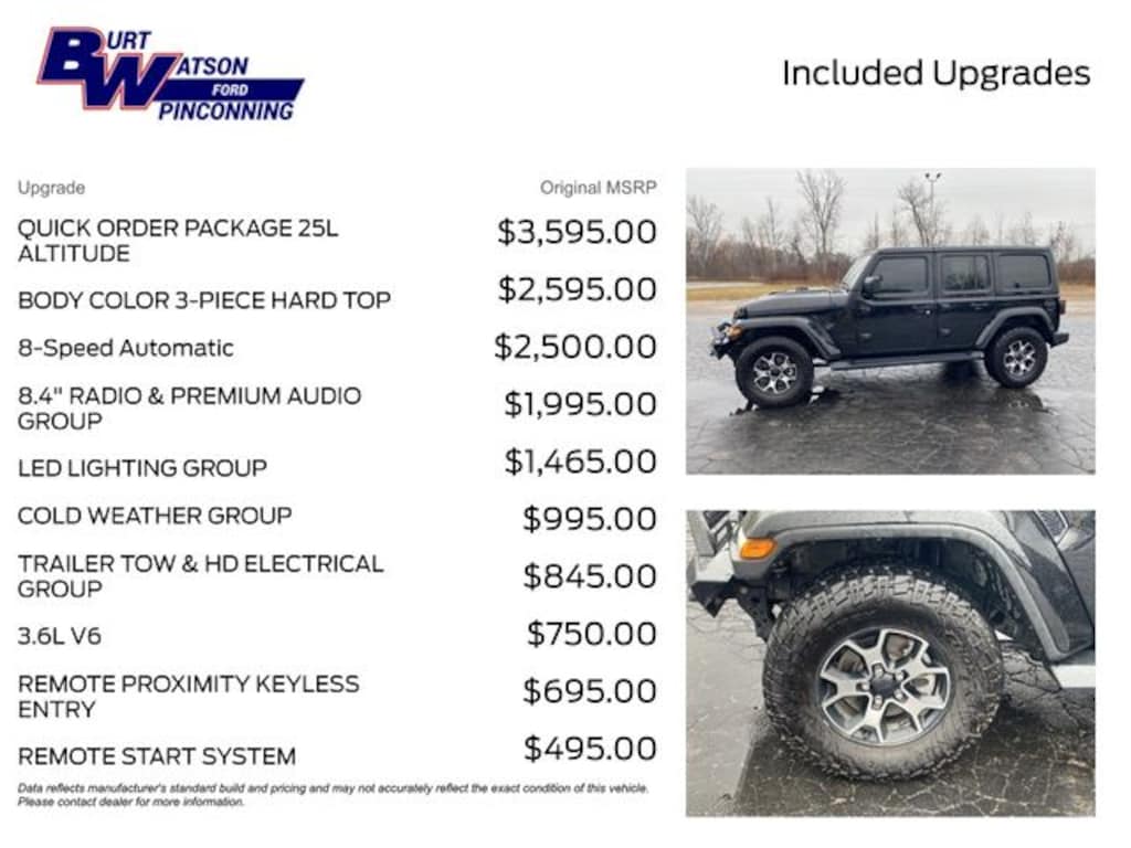 Local Trade, Non Smoker, Leather Seats, 172 point inspection certified, 2 Key Fobs, Heated Seats, 1-Year SiriusXM Guardian Trial, 240 Amp Alternator, 4G LTE Wi-Fi Hot Spot, 5-Year SiriusXM Traffic Service, 5-Year SiriusXM Travel Link Service, 7 & 4 Pin Wiring Harness, 700 Amp Maintenance Free Battery, 8 Speakers, 8.4" Radio & Premium Audio Group, 8.4" Touchscreen Display, Alpine Premium Audio System, Apple CarPlay, Auto-Dimming Rear-View Mirror, Auxiliary Switches, Black Interior Accents, Black Trail Rated Badge, Body Color 3-Piece Hard Top, Body Color Grille w/Gloss Black Rings, Brake assist, Class II Receiver Hitch, Cold Weather Group, Daytime Running Lamps LED Accents, Delay-off headlights, Electronic Stability Control, Emergency/Assistance Call, For Details, Visit DriveUconnect.com, Front anti-roll bar, Front fog lights, Front LED Fog Lamps, Fully automatic headlights, GPS Antenna Input, GPS Navigation, HD Radio, Heated Front Seats, Heated Steering Wheel, Integrated roll-over protection, Leather Trimmed Bucket Seats, Leather Wrapped Park Brake Handle, Leather Wrapped Shift Knob, LED Lighting Group, LED Premium Reflector Headlamps, LED Taillamps, Low tire pressure warning, Matte Black Jeep Badge, Mold In Color Bumper w/Gloss Black, MOPAR Hardtop Headliner, Navigation System, Occupant sensing airbag, ParkView Rear Back-Up Camera, Quick Order Package 25L Altitude (DISC), Radio data system, Radio: Uconnect 4 w/7" Display, Radio: Uconnect 4C Nav w/8.4" Display, Rear anti-roll bar, Remote Proximity Keyless Entry, Remote Start System, Selec-Speed Control, SiriusXM Traffic Plus, SiriusXM Travel Link, Trailer Tow & HD Electrical Group, Wheels: 18" x 7.5" Gloss Black Aluminum, Wizard Black Instrument Panel Bezels, 3.45 Rear Axle Ratio, 4-Wheel Disc Brakes, ABS brakes, Air Conditioning, Alloy wheels, AM/FM radio: SiriusXM, Apple CarPlay/Android Auto, Automatic temperature control, Aux Battery, Cloth Low-Back Bucket Seats, Compass, Driver door bin, Driver vanity mirror, Dual front impact airbags, Dual front side impact airbags, Front Bucket Seats, Front Center Armrest w/Storage, Front dual zone A/C, Front reading lights, Garage door transmitter, Google Android Auto, Heated door mirrors, Heavy Duty Suspension w/Gas Shocks, Illuminated entry, Integrated Voice Command w/Bluetooth, Leather steering wheel, Manufacturer's Statement of Origin, MOPAR All-Weather Floor Mats (DISC), Non-Lock Fuel Cap w/o Discriminator, Outside temperature display, Panic alarm, Passenger door bin, Passenger vanity mirror, Power door mirrors, Power steering, Power windows, Rear reading lights, Remote keyless entry, Security system, Speed control, Split folding rear seat, Steering wheel mounted audio controls, Stop-Start Dual Battery System, Tachometer, Telescoping steering wheel, Tilt steering wheel, Traction control, Trip computer, Variably intermittent wipers, Voltmeter, Wheels: 18" x 7.5" Polished w/Gray Spokes, 1-Year SiriusXM Guardian Trial, 240 Amp Alternator, 4G LTE Wi-Fi Hot Spot, 5-Year SiriusXM Traffic Service, 5-Year SiriusXM Travel Link Service, 7 & 4 Pin Wiring Harness, 700 Amp Maintenance Free Battery, 8 Speakers, 8.4" Radio & Premium Audio Group, 8.4" Touchscreen Display, Alpine Premium Audio System, Apple CarPlay, Auto-Dimming Rear-View Mirror, Auxiliary Switches, Black Interior Accents, Black Trail Rated Badge, Body Color 3-Piece Hard Top, Body Color Grille w/Gloss Black Rings, Brake assist, Class II Receiver Hitch, Cold Weather Group, Daytime Running Lamps LED Accents, Delay-off headlights, Electronic Stability Control, Emergency/Assistance Call, For Details, Visit DriveUconnect.com, Front anti-roll bar, Front fog lights, Front LED Fog Lamps, Fully automatic headlights, GPS Antenna Input, GPS