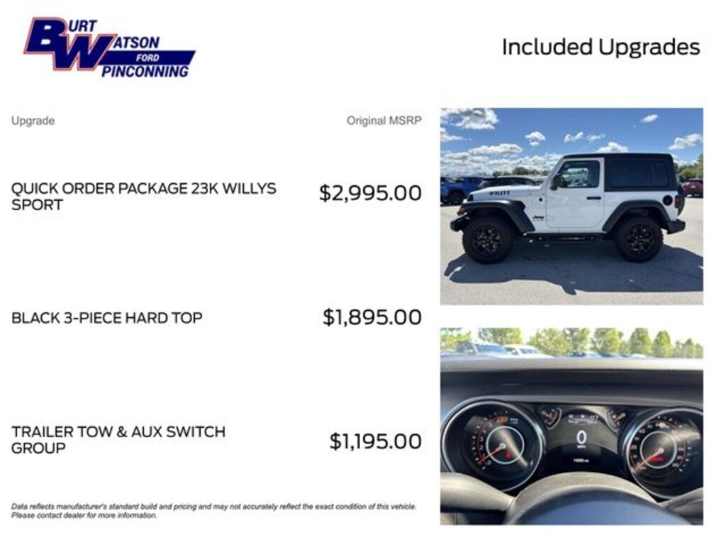 240 Amp Alternator, 3.45 Overall Top Gear Ratio, 4-Wheel Disc Brakes, 4-Wheel Drive Swing Gate Decal, 7 & 4 Pin Wiring Harness, 700 Amp Maintenance Free Battery, 8 Speakers, ABS brakes, AM/FM radio, Anti-Spin Differential Rear Axle, Apple CarPlay, Apple CarPlay/Android Auto, Auxiliary Battery, Auxiliary Switches, Black 3-Piece Hard Top, Black Grille, Brake assist, Class II Receiver Hitch, Cloth Low-Back Bucket Seats, Compass, Deep Tint Sunscreen Windows, Delay-off headlights, Driver door bin, Driver vanity mirror, Dual front impact airbags, Dual front side impact airbags, Electronic Stability Control, Emergency communication system: SiriusXM Guardian, Engine Oil Cooler, Freedom Panel Storage Bag, Front anti-roll bar, Front Bucket Seats, Front Center Armrest w/Storage, Front fog lights, Front reading lights, Google Android Auto, GPS Antenna Input, Integrated Center Stack Radio, Integrated roll-over protection, Integrated Voice Command w/Bluetooth, Low tire pressure warning, Mold In Color Bumper w/Gloss Black, MOPAR All-Weather Floor Mats, No Soft Top, Non-Locking Fuel Cap w/o Discriminator, Normal Duty Suspension, Occupant sensing airbag, Outside temperature display, ParkView Rear Back-Up Camera, Passenger door bin, Passenger vanity mirror, Power steering, Quick Order Package 23K Willys Sport, Radio data system, Radio: Uconnect 4 w/7" Display, Rear anti-roll bar, Rear reading lights, Rear Window Defroster, Rear Window Wiper/Washer, Speed control, Start-Stop Dual Battery System, Steering wheel mounted audio controls, Tachometer, Telescoping steering wheel, Tilt steering wheel, Traction control, Trailer Tow & Aux Switch Group, Trip computer, USB Host Flip, Variably intermittent wipers, Wheels: 17" x 7.5" Black Aluminum, Wheels: 17" x 7.5" Black Steel Styled, Wheels: 17" x 7.5" Moab Black Aluminum (DISC), Willys, Willys Hood Decal.