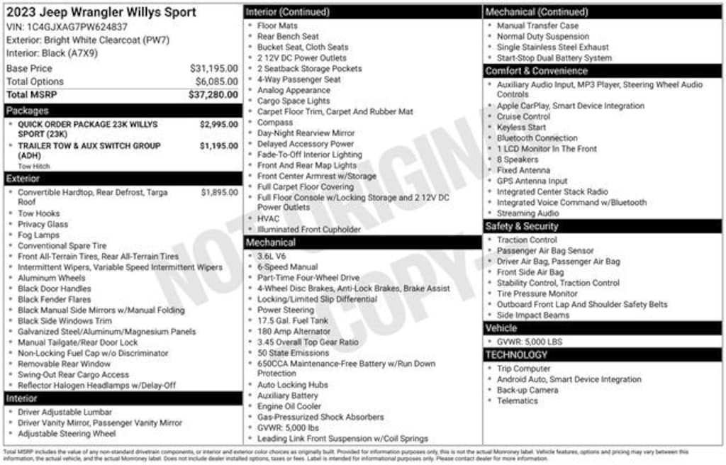 240 Amp Alternator, 3.45 Overall Top Gear Ratio, 4-Wheel Disc Brakes, 4-Wheel Drive Swing Gate Decal, 7 & 4 Pin Wiring Harness, 700 Amp Maintenance Free Battery, 8 Speakers, ABS brakes, AM/FM radio, Anti-Spin Differential Rear Axle, Apple CarPlay, Apple CarPlay/Android Auto, Auxiliary Battery, Auxiliary Switches, Black 3-Piece Hard Top, Black Grille, Brake assist, Class II Receiver Hitch, Cloth Low-Back Bucket Seats, Compass, Deep Tint Sunscreen Windows, Delay-off headlights, Driver door bin, Driver vanity mirror, Dual front impact airbags, Dual front side impact airbags, Electronic Stability Control, Emergency communication system: SiriusXM Guardian, Engine Oil Cooler, Freedom Panel Storage Bag, Front anti-roll bar, Front Bucket Seats, Front Center Armrest w/Storage, Front fog lights, Front reading lights, Google Android Auto, GPS Antenna Input, Integrated Center Stack Radio, Integrated roll-over protection, Integrated Voice Command w/Bluetooth, Low tire pressure warning, Mold In Color Bumper w/Gloss Black, MOPAR All-Weather Floor Mats, No Soft Top, Non-Locking Fuel Cap w/o Discriminator, Normal Duty Suspension, Occupant sensing airbag, Outside temperature display, ParkView Rear Back-Up Camera, Passenger door bin, Passenger vanity mirror, Power steering, Quick Order Package 23K Willys Sport, Radio data system, Radio: Uconnect 4 w/7 Display, Rear anti-roll bar, Rear reading lights, Rear Window Defroster, Rear Window Wiper/Washer, Speed control, Start-Stop Dual Battery System, Steering wheel mounted audio controls, Tachometer, Telescoping steering wheel, Tilt steering wheel, Traction control, Trailer Tow & Aux Switch Group, Trip computer, USB Host Flip, Variably intermittent wipers, Wheels: 17 x 7.5 Black Aluminum, Wheels: 17 x 7.5 Black Steel Styled, Wheels: 17 x 7.5 Moab Black Aluminum (DISC), Willys, Willys Hood Decal.