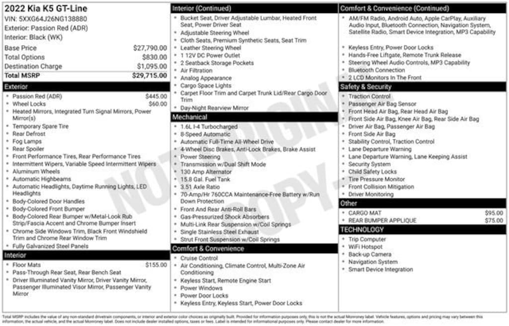 *** WE DELIVER ***Passion Red 2022 Kia K5 GT-Line 4D Sedan I4 8-Speed Automatic AWD4-Wheel Disc Brakes, 6 Speakers, ABS brakes, Air Conditioning, Alloy wheels, AM/FM radio: SiriusXM, Apple CarPlay & Android Auto, Auto High-beam Headlights, Automatic temperature control, Brake assist, Bumpers: body-color, Cargo Mat, Carpeted Floor Mats, Cloth/Leatherette Seat Trim, Delay-off headlights, Driver door bin, Driver vanity mirror, Dual front impact airbags, Dual front side impact airbags, Electronic Stability Control, Four wheel independent suspension, Front anti-roll bar, Front Bucket Seats, Front Center Armrest, Front dual zone A/C, Front fog lights, Front reading lights, Fully automatic headlights, Heated door mirrors, Heated Front Bucket Seats, Heated front seats, Illuminated entry, Knee airbag, Low tire pressure warning, Navigation System, Occupant sensing airbag, Outside temperature display, Overhead airbag, Overhead console, Panic alarm, Passenger door bin, Passenger vanity mirror, Power door mirrors, Power driver seat, Power steering, Power windows, Radio data system, Radio: AM/FM/MP3 Audio System, Rear anti-roll bar, Rear Bumper Applique, Rear seat center armrest, Rear side impact airbag, Rear window defroster, Remote keyless entry, Security system, Speed control, Speed-sensing steering, Split folding rear seat, Spoiler, Sport steering wheel, Steering wheel mounted audio controls, Tachometer, Telescoping steering wheel, Tilt steering wheel, Traction control, Trip computer, Turn signal indicator mirrors, Variably intermittent wipers, Wheel Locks, Wheels: 7.5J x 18 Gloss Black Machined Finish Alloy.