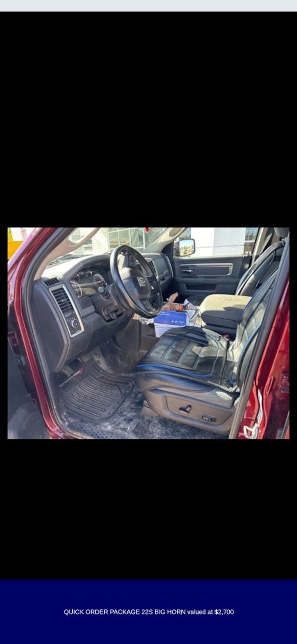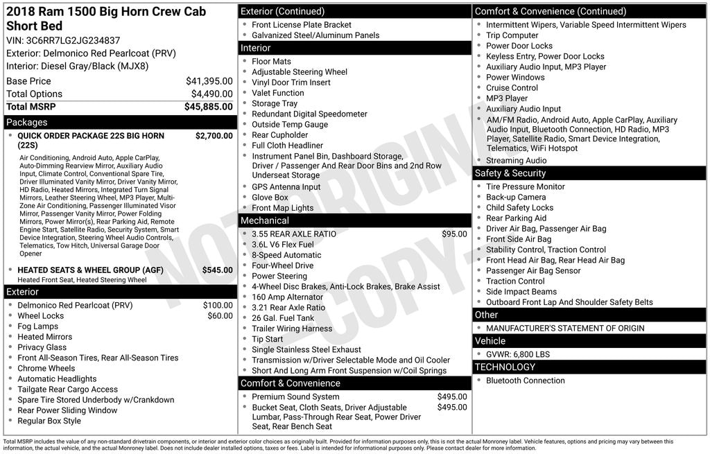 125 point inspection, 1500 Big Horn, 4WD, 1-Yr SiriusXM Guardian Trial, 115V Auxiliary Power Outlet, 40/20/40 Split Bench Seat, 8.4" Touchscreen Display, Air Conditioning ATC w/Dual Zone Control, Apple CarPlay, Audio Jack Input for Mobile Devices, Auto-Dimming Exterior Mirrors, Auto-Dimming Rear-View Mirror, Big Horn Badge, Big Horn Regional Package, Bright/Bright Billets Grille, Charge Only Remote USB Port, Class IV Receiver Hitch, Electric Shift-On-Demand Transfer Case, Electroluminescent Instrument Cluster, Exterior Mirrors Courtesy Lamps, Exterior Mirrors w/Supplemental Signals, Folding Flat Load Floor Storage, Front Armrest w/3 Cupholders, Front Center Seat Cushion Storage, Front Fog Lamps, Glove Box Lamp, Google Android Auto, GPS Antenna Input, HD Radio, Heated Front Seats, Heated Seats & Wheel Group, Heated Steering Wheel, Humidity Sensor, Integrated Voice Command w/Bluetooth, Leather Wrapped Steering Wheel, LED Bed Lighting, Media Hub (2 USB, AUX), Overhead Console w/Garage Door Opener, ParkSense Front/Rear Park Assist System, ParkSense Rear Park Assist System, Power 10-Way Driver Seat, Power Heated Fold-Away Mirrors, Power Lumbar Adjust, Power-Folding Mirrors, Premium Cloth 40/20/40 Bench Seat, Quick Order Package 22S Big Horn, Radio: Uconnect 4C w/8.4" Display, Rear 60/40 Split Folding Seat, Rear Dome w/On/Off Switch Lamp, Rear Floor Mats, Rear Power Sliding Window, Remote Start System, Remote USB Port, Security Alarm, SiriusXM Satellite Radio, Steering Wheel Mounted Audio Controls, Storage Tray, Sun Visors w/Illuminated Vanity Mirrors, Universal Garage Door Opener, USB Host Flip, Wheels: 20" x 8" Aluminum Chrome Clad, 4-Wheel Disc Brakes, 6 Speakers, 9 Alpine Speakers w/Subwoofer (DISC), ABS brakes, Active Grille Shutters, Air Conditioning, Alloy wheels, AM/FM radio: SiriusXM, Black Exterior Mirrors, Brake assist, Bumpers: chrome, Center Hub, Class IV Receiver Hitch (DISC), Compass, Delay-off headlights, Driver door bin, Dual front impact airbags, Dual front side impact airbags, Electronic Shift, Electronic Stability Control, Exterior Mirrors w/Heating Element, Front anti-roll bar, Front Center Armrest w/Storage, Front reading lights, Front wheel independent suspension, Fully automatic headlights, Heated door mirrors, Illuminated entry, Low tire pressure warning, Manufacturer's Statement of Origin, Occupant sensing airbag, Outside temperature display, Overhead airbag, Overhead console, Panic alarm, ParkView Rear Back-Up Camera, Passenger door bin, Passenger vanity mirror, Power door mirrors, Power steering, Power windows, Radio data system, Rear anti-roll bar, Rear seat center armrest, Rear step bumper, Remote keyless entry, Speed control, Tachometer, Tilt steering wheel, Tip Start, Traction control, Trip computer, Variably intermittent wipers, Voltmeter, 1500 Big Horn, 4WD, 1-Yr SiriusXM Guardian Trial, 115V Auxiliary Power Outlet, 40/20/40 Split Bench Seat, 8.4" Touchscreen Display, Air Conditioning ATC w/Dual Zone Control, Apple CarPlay, Audio Jack Input for Mobile Devices, Auto-Dimming Exterior Mirrors, Auto-Dimming Rear-View Mirror, Big Horn Badge, Big Horn Regional Package, Bright/Bright Billets Grille, Charge Only Remote USB Port, Class IV Receiver Hitch, Electric Shift-On-Demand Transfer Case, Electroluminescent Instrument Cluster, Exterior Mirrors Courtesy Lamps, Exterior Mirrors w/Supplemental Signals, Folding Flat Load Floor Storage, Front Armrest w/3 Cupholders, Front Center Seat Cushion Storage, Front Fog Lamps, Glove Box Lamp, Google Android Auto, GPS Antenna Input, HD Radio, Heated Front Seats, Heated Seats & Wheel Group, Heated Steering Wheel, Humidity Sensor, Integrated Voice Command w/Bluetooth, Leather Wrapped Steering Wheel, LED Bed Lighting, Media Hub (2 USB, AUX), Overhead Console w/Garage
