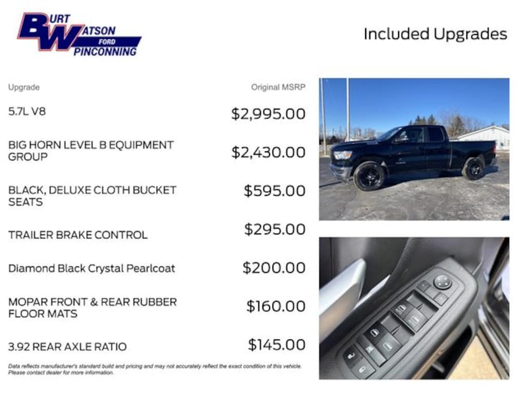 ** Midnight Edition **, ** Originally Sold and Serviced with Burt Watson Family **, Local Trade, Non Smoker, 2 key sets, 172 point inspection certified, 1st oil change free with purchase, 2 Key Fobs, service report available, Heated Seats, Digital Key, In-Vehicle Wi-Fi, Stolen vehicle location/ recovery system, 115V Auxiliary Power Outlet, 115V Auxiliary Rear Power Outlet, 3 Rear Seat Head Restraints, 3.92 Rear Axle Ratio, 4 Way Front Headrests, 4-Wheel Disc Brakes, 400W Inverter, 48V Belt Starter Generator, 4G LTE Wi-Fi Hot Spot, 6 Speakers, 8.4" Touchscreen Display, ABS brakes, Accent Color Premium Power Mirrors, Advanced Brake Assist, Air Conditioning, Air Conditioning ATC w/Dual Zone Control, All Plant-Installed Decals, Alloy wheels, AM/FM radio, Anti-Spin Differential Rear Axle, Apple CarPlay, Auto-Dimming Exterior Driver Mirror, Auto-Dimming Rear-View Mirror, Big Horn Badge, Big Horn Level B Equipment Group (DISC), Black Exterior Mirrors, Black Exterior Truck Badging, Black Headlamp Bezels, Black Interior Accents, Black Painted Exterior Mirrors Caps, Black Premium Power Mirrors (GUL), Blind Spot & Cross Path Detection, Bluetooth Handsfree Phone & Audio, Body Color Front Bumper, Body Color Premium Power Mirrors, Body Color Rear Bumper w/Step Pads, Brake assist, Bucket Seats, Bumpers: chrome, Class IV Receiver Hitch, Cloth Bench Seat, Cluster 7.0" TFT Color Display, Compass, Connectivity - US/Canada, Convex Wide-Angle Mirror Insert, Delay-off headlights, Delete LED Lamp - Floor Console Bin, Deluxe Cloth Bucket Seats, Driver door bin, Dual Exhaust w/Black Tips, Dual front impact airbags, Dual front side impact airbags, E-Locker Rear Axle, Electronic Stability Control, Emergency communication system: SiriusXM Guardian, Exterior Mirrors Courtesy Lamps, Exterior Mirrors w/Supplemental Signals, Foam Bottle Insert (Door Trim Panel), For More Info, Call 800-643-2112, Front anti-roll bar, Front Center Armrest w/Storage, Front Extra HD Shock Absorbers, Front fog lights, Front LED Fog Lamps, Front License Plate Bracket, Front reading lights, Front Seat Back Map Pockets, Front wheel independent suspension, Full Length Floor Console, Fully automatic headlights, Global Telematics Box Module (TBM), Glove Box Lamp, Google Android Auto, GPS Antenna Input, GPS Navigation, Grille Surround 1 Black Texture 2 Black, Heated door mirrors, Heated Front Seats, Heated Steering Wheel, Hill Descent Control, Illuminated entry, Integrated Center Stack Radio, Integrated Voice Command w/Bluetooth, Leather steering wheel, LED Reflector Headlamps, LED Taillamps, Low tire pressure warning, Manual Adjust 4-Way Front Passenger Seat, Manufacturer's Statement of Origin, Media Hub w/2 Charge Only USBs, MOPAR 4 Adjustable Cargo Tie-Down Hooks, MOPAR Front & Rear Rubber Floor Mats, Night Edition, Night Edition (DISC), Occupant sensing airbag, Off Road Decals, Off Road Group, Outside temperature display, Overhead airbag, Overhead console, Panic alarm, ParkSense Front/Rear Park Assist w/Stop, ParkView Rear Back-Up Camera, Passenger door bin, Passenger vanity mirror, Power 2-Way Driver Lumbar Adjust, Power 8-Way Driver Seat, Power Adjustable Pedals, Power door mirrors, Power steering, Power windows, Premium Lighting Group, Quick Order Package 25Z Big Horn, Radio data system, Radio: Uconnect 3 w/5" Display, Radio: Uconnect 5 W w/8.4" Display, Raised Ride Height, Rear 60/40 Folding Seat, Rear anti-roll bar, Rear Dome w/On/Off Switch Lamp, Rear Extra HD Shock Absorbers, Rear Power Sliding Window, Rear seat center armrest, Rear step bumper, Rear Window Defroster, Remote keyless entry, Remote Start System, Security Alarm, SiriusXM Radio Service, SiriusXM Satellite Radio, SiriusXM w/360L, Speed control, Split